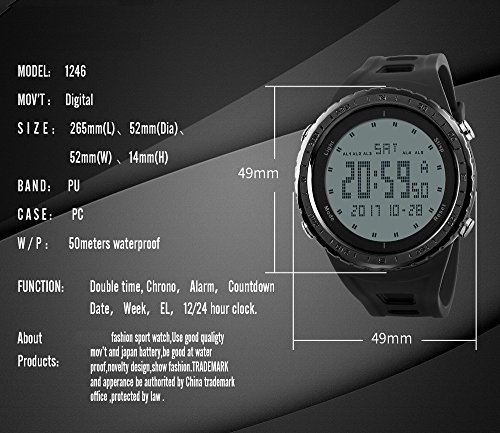 -. Binding : Watch -. Brand : Sooydoor -. Color : Black -. Department : MENS -. EAN : 0758150444761 -. Feature : One Button Push - Switch To Military Time! / 49mm/1.92in Large Face Double Time Green LED 12/24H Format / 64FT/50m Water Resistant: Showering, Hand washing, Swimming. / Band Length (Included the case): 260mm/10.2in / Watchcase Thin Thickness: 14mm/0.55in -. Label : Sooydoor -. Manufacturer : Sooydoor -. MPN : 1246 -. PackageQuantity : 1 -. PartNumber : 1246 -. ProductGroup : Watch -. ProductTypeName : BEAUTY -. Publisher : Sooydoor -. Size : 49mm -. Studio : Sooydoor -. Title : Men's Double Time Digital Sport Watch Thin Military Army Large Face Dial LED Outdoor Electronic Wrist Watches Waterproof Fashion Casual Tactical Stopwatch Black -. UPC : 758150444761