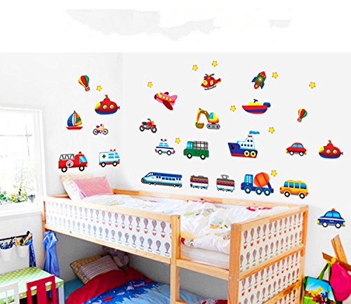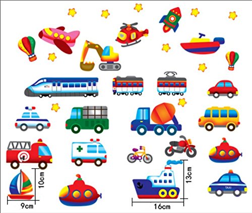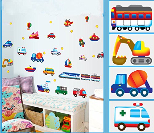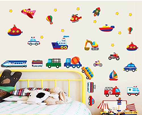 Baby Nursery Traffic Wall Decals for Kids Rooms, Nursery, Baby, Boys & Girls Bedroom - Peel & Stick,Removable Vinyl Wall Stickers - Lovely Bus Rocket Boat Train Truck Balloon Bike