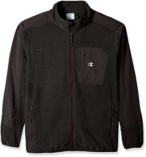 Studio : Champion Mens Outerwear Publisher : Champion Mens Outerwear Binding : Apparel Product Description Champion men's big and tall mock neck, set in sleeve, textured fleece features a 4-way stretch overlay strategically added for water resistant. Zip front entry w/stretch elastic cuff and hem, zippered exterior pockets . An exterior heat transfer chest pocket adds accent of color as well extra storage space. Interior smart pocket and media portal finish the details of this fleece. 0