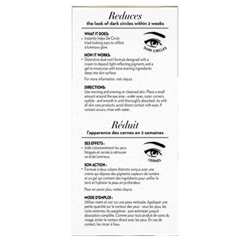 Reveal even skin tone under and around the eyes with Olay eyes illuminating eye cream for dark circles under eyes. The distinctive dual-swirl formula is designed with an eye cream to deposit light-reflecting pigments and a gel to deliver tone-evening ingredients deep in skin's surface. The eye cream hydrates and regenerates skin around the eyes revealing smoother, more radiant skin. Ophthalmologist tested, this lightweight formula reduces the look of dark circles and quickly brightens the area around your eyes. Use it every morning and night for continued results over time. Our formula starts to work from day one and with daily use, you'll see a noticeable difference in more even skin over time.Feature