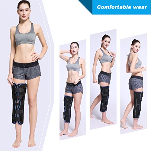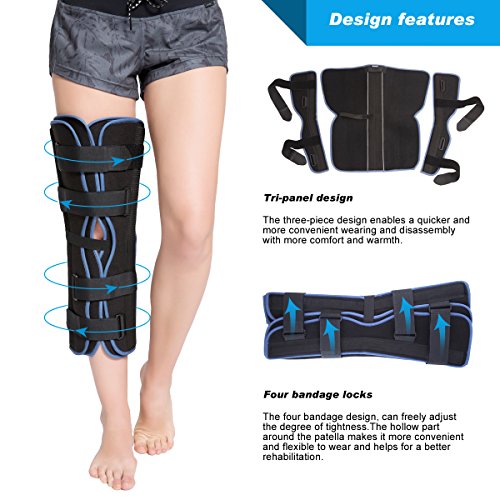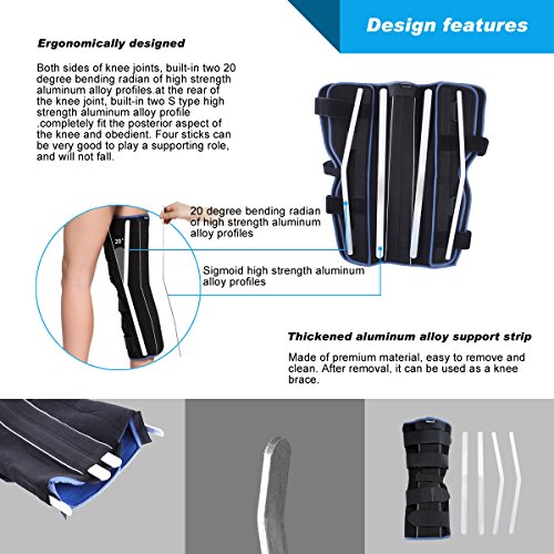 - BREATHTAKING DESIGN & PERFECT FIT:Open design, bring better comfort experience. At the rear and both sides of knee joints, built-in four high strength aluminum alloy profiles, completely fit the posterior aspect of the knee and obedient. Four sticks can be very good to play a supporting role, and will not fall. The tightness of four bandages can be adjusted depending on patients’actual conditions to render it into the most comfortable state.