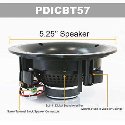 -. Binding : Electronics -. Brand : Pyle -. Color : Black -. EAN : 0068888772433 -. Feature : BLUETOOTH - Built-in Bluetooth no hassle wireless music streaming from all your favorite Bluetooth enabled devices. Perfect for incredible stereo sound in any room in your home from speakers you can barely see without using any floor or shelf space. / SPEAKER GRILL - Includes built in round stain resistant speaker grills. Match existing flush mounted designs in your home or workplace for a clean look & achieve wide-range sound performance without compromise. / SEAMLESS INTEGRATION - Perfect sound wherever you need it. Great for existing home theater systems and custom applications this Pyle 2-way in-ceiling or in-wall speaker system will deliver on-demand crisp audio sound clarity all the time. / FLUSH MOUNT DESIGN - Compact flush mount design for simple easy installation in-wall / in-ceiling , or pre-cut speaker openings, for in home use, office, professional, or custom audio applications on any flat surface. / EASY TO INSTALL - Includes a cut-out size template screw terminal block speaker connectors with ability to DAISY-CHAIN SPEAKERS for simple, easy, no hassle installation with included speaker connection wire, bluetooth Controller & power supply. -. Label : Sound Around -. Manufacturer : Sound Around -. Model : PDICBT57 -. MPN : PDICBT57 -. NumberOfItems : 1 -. PackageQuantity : 1 -. PartNumber : PDICBT57 -. ProductGroup : Speakers -. ProductTypeName : SPEAKERS -. Publisher : Sound Around -. Size : 5.25 -. Studio : Sound Around -. Title : Pyle 5.25” Pair Bluetooth Universal Flush Mount In-wall In-ceiling 2-Way Speaker System Dual Polypropylene Cone & Polymer Tweeter Stereo Sound 240 Watts (PDICBT57) -. UPC : 068888772433 -. Warranty : 1 Year Limited