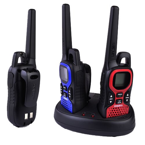 -. Feature : Three (3) 2-way radios (one black, one blue & one red) / Up to 37 Mile Range, 22 Channels: 15 GMRS / 7 FRS channels,7 NOAA Weather Channels / Backlit LCD display, 3.5mm headset jack and Belt clips / Includes three 3.6V, 550mAh NiMH battery packs or can be powered with 3 'AAA' batteries(not included) / Includes dual charging cradle with AC adapter