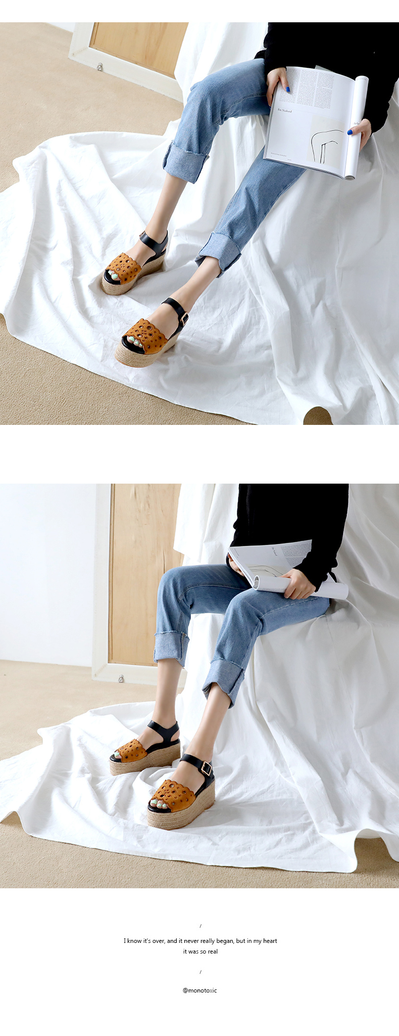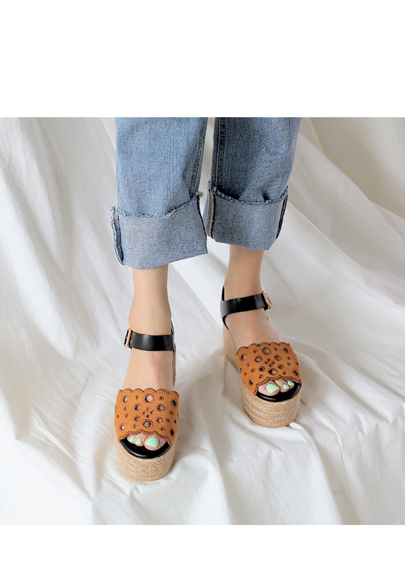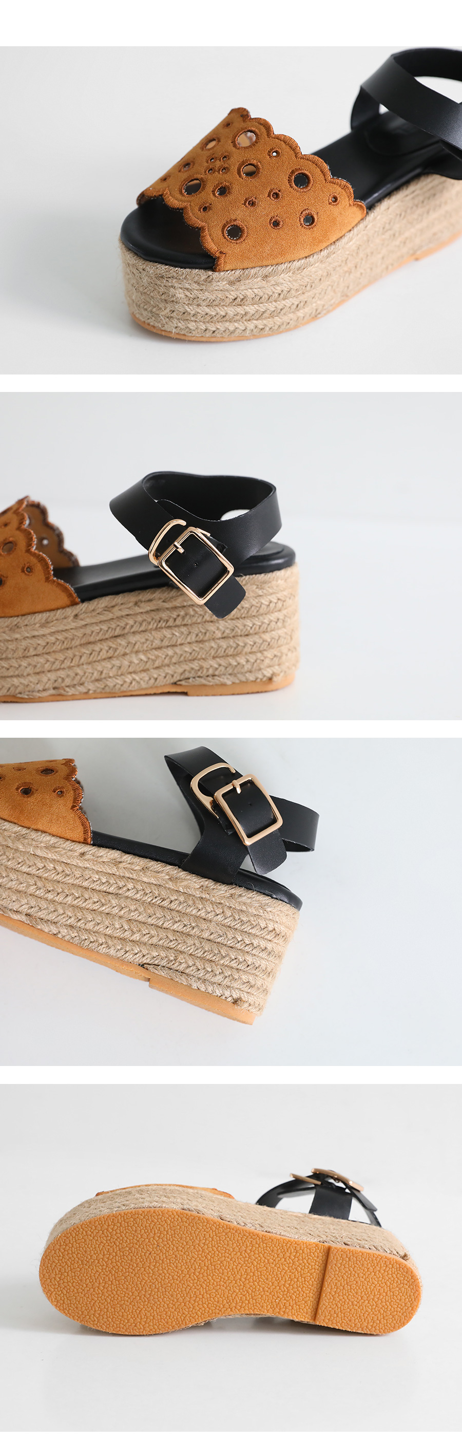 DETAILS - 소재 : 인조소가죽 에스파드류(블랙) 인조스웨이드 에스파드류(브라운) - 컬러 : brown,black - 피팅감 : 정사이즈 / 무게 : 보통인편 - 착화감 : 안정감있는 굽라인으로 편안한 착화감이에요 - 모델피팅 : 230