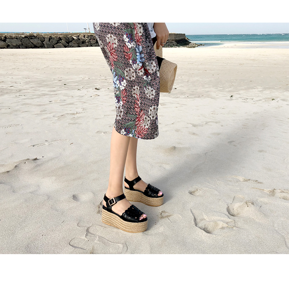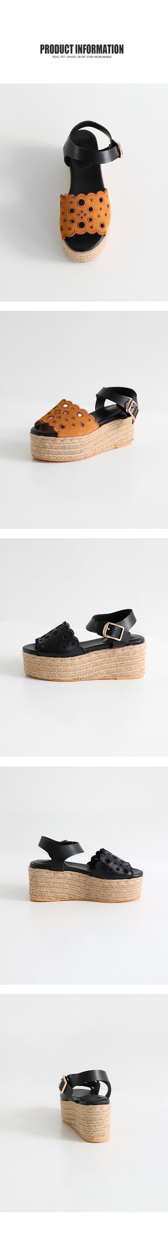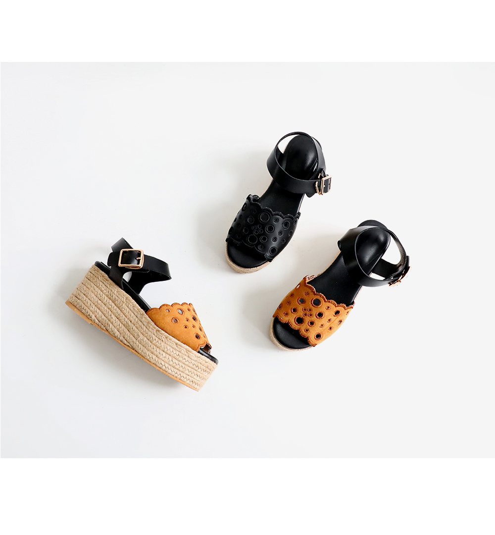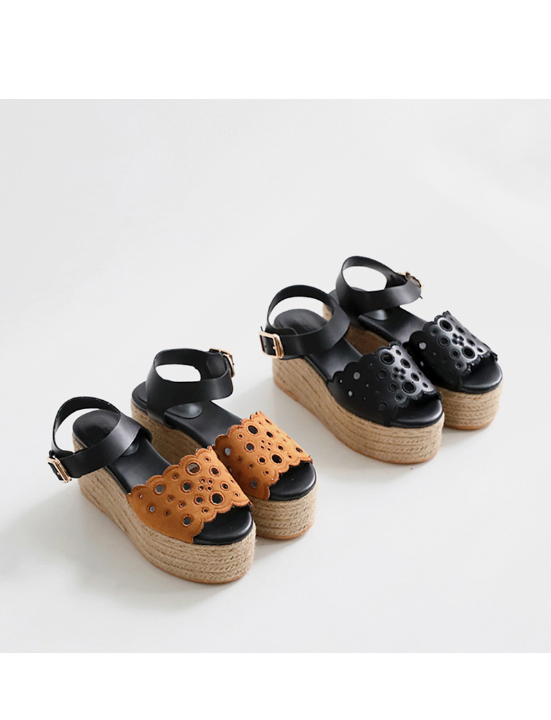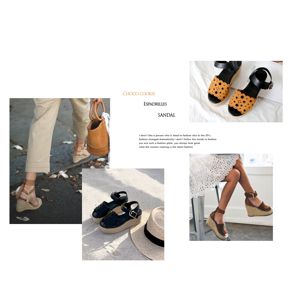 통굽으로 디자인하여 발에 부담없이 키를 보정해주며 자칫 밋밋해보일 수 있는 굽의 옆에 에스파드류로 s/s 에 알맞게 제작되어 세련되어 보입니다.