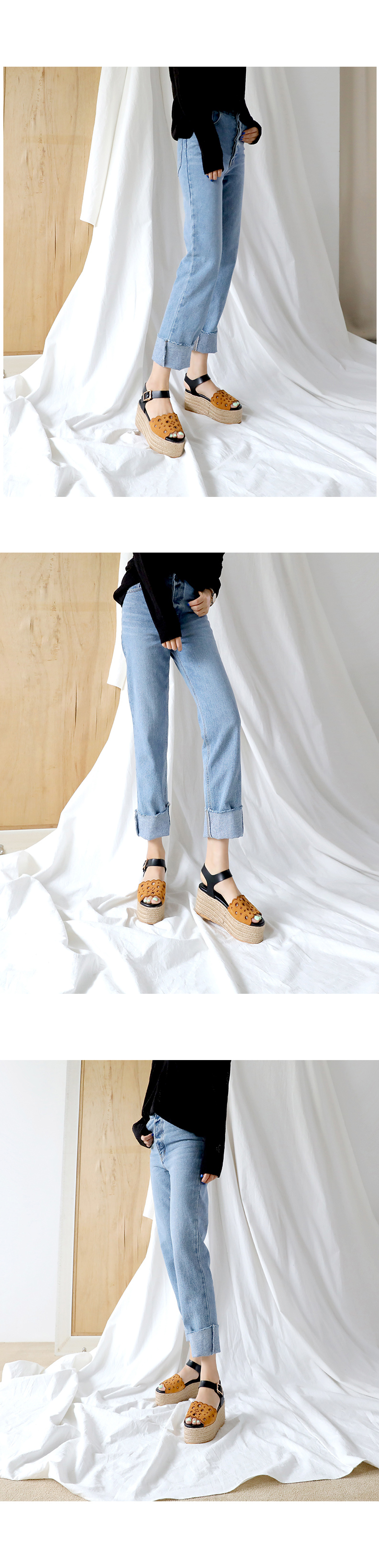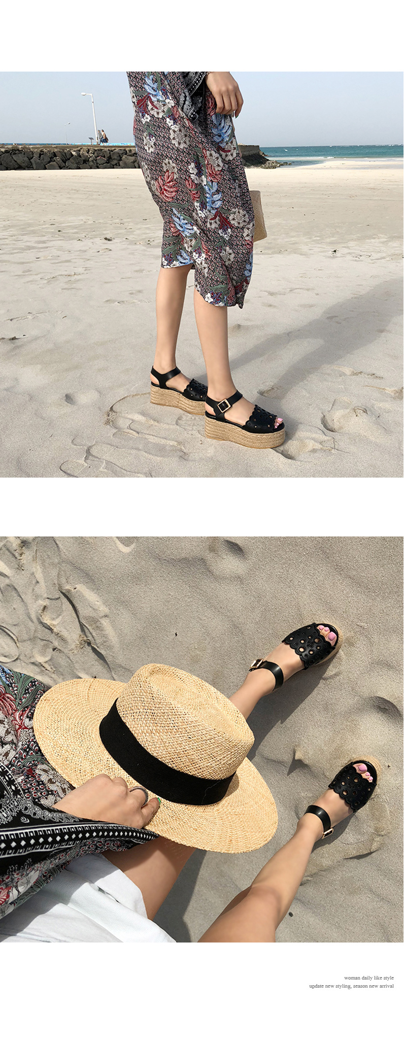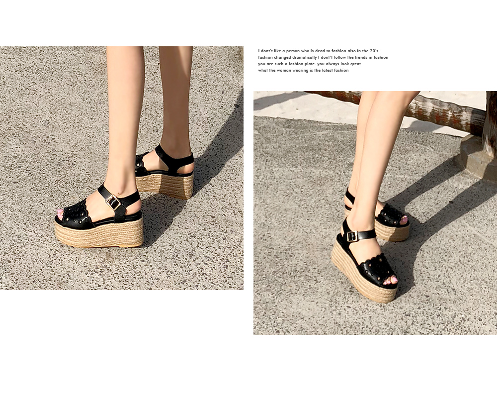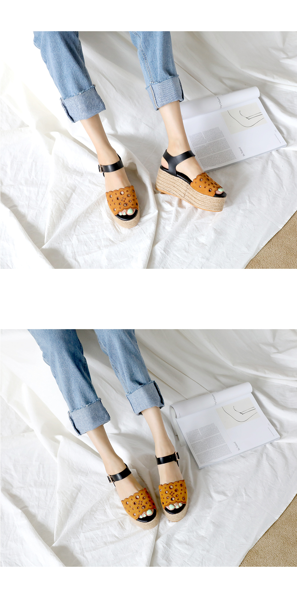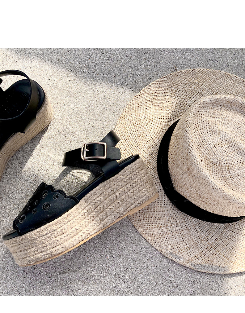 통굽으로 디자인하여 발에 부담없이 키를 보정해주며 자칫 밋밋해보일 수 있는 굽의 옆에 에스파드류로 s/s 에 알맞게 제작되어 세련되어 보입니다.