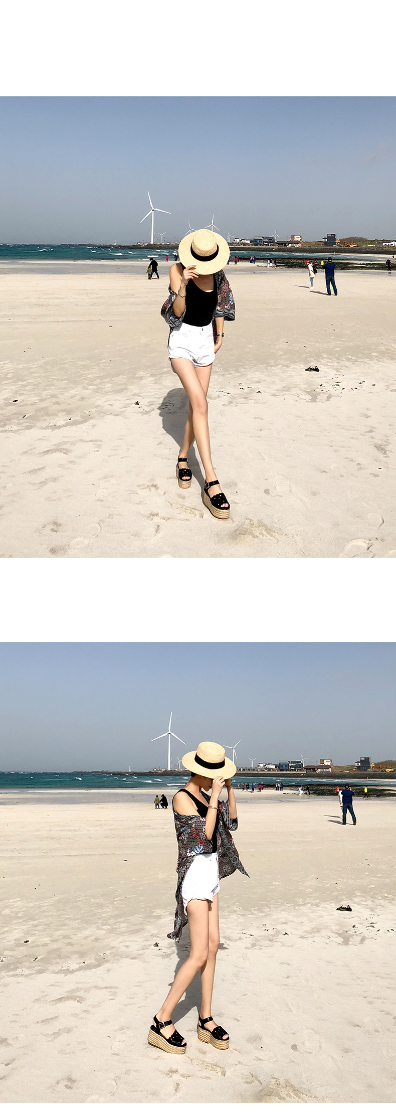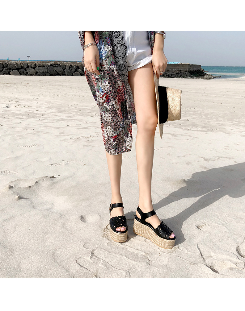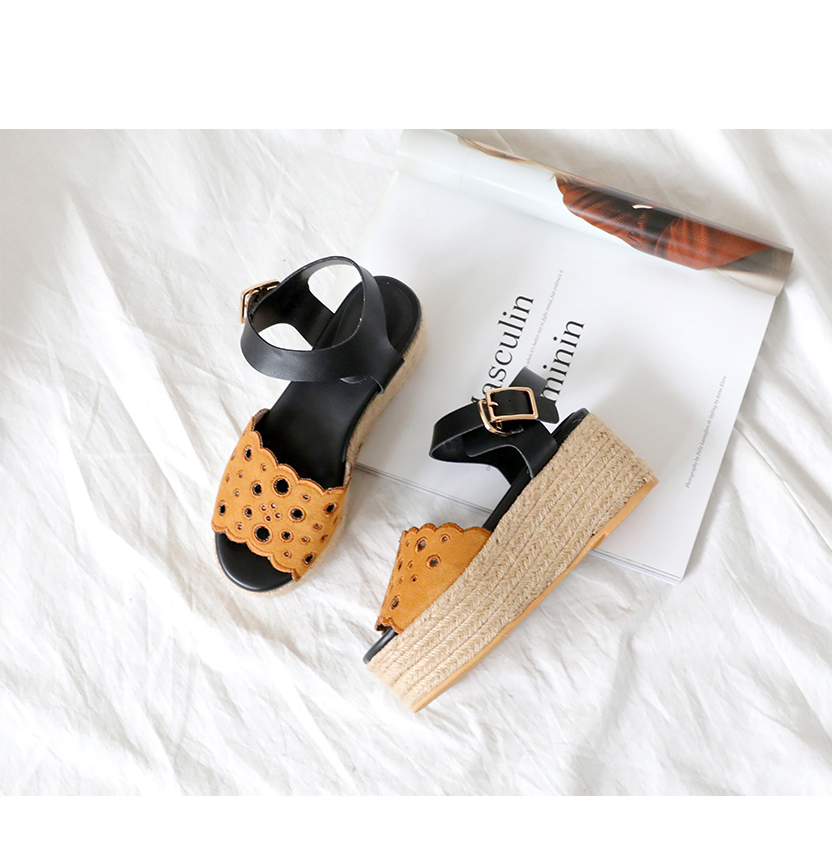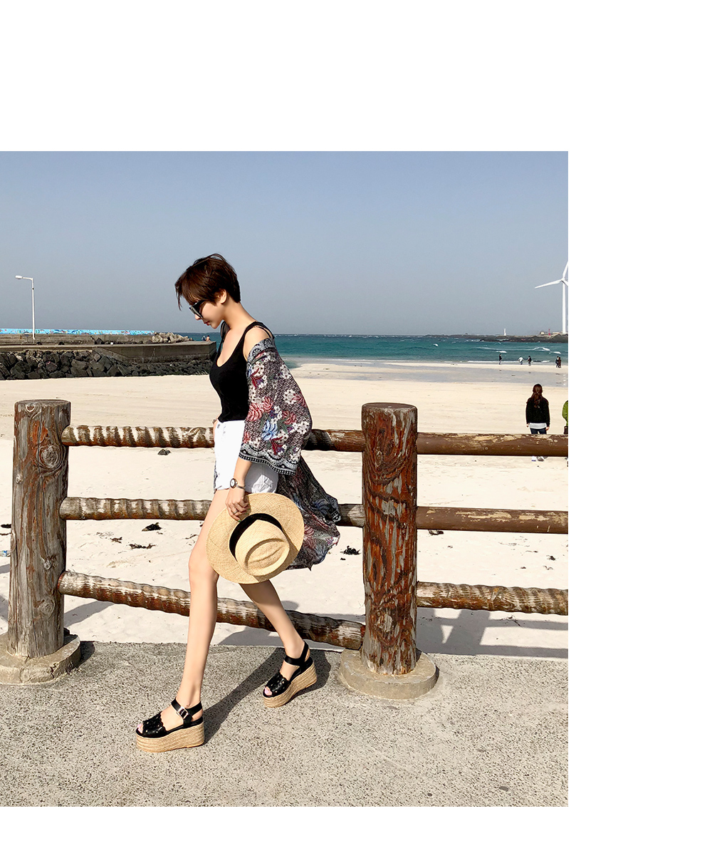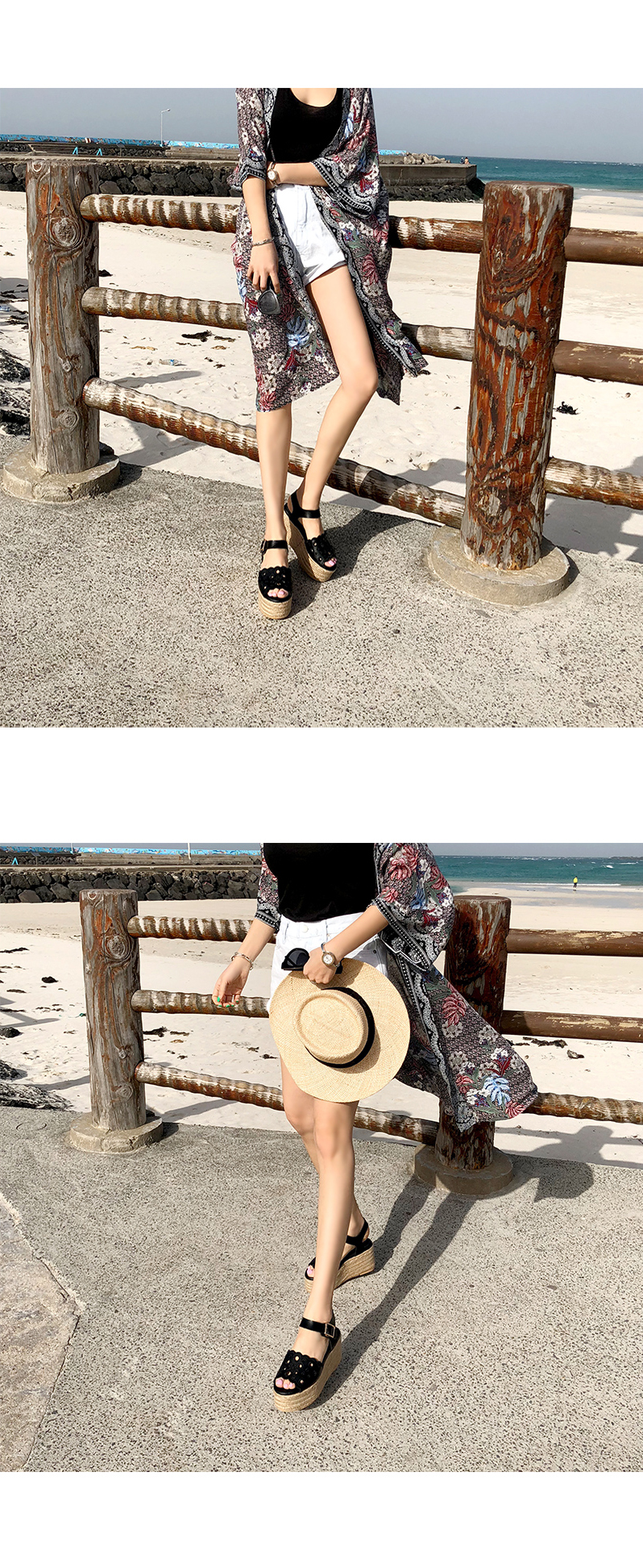 통굽으로 디자인하여 발에 부담없이 키를 보정해주며 자칫 밋밋해보일 수 있는 굽의 옆에 에스파드류로 s/s 에 알맞게 제작되어 세련되어 보입니다.