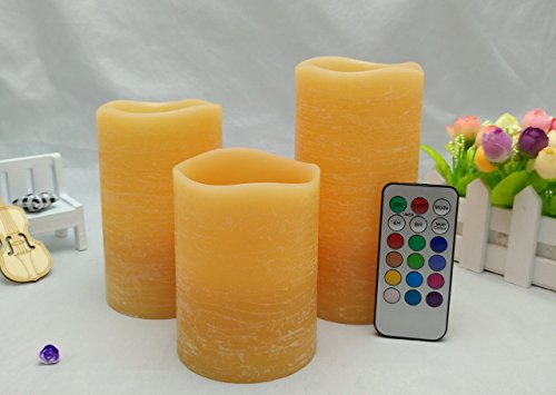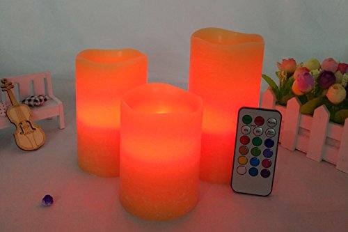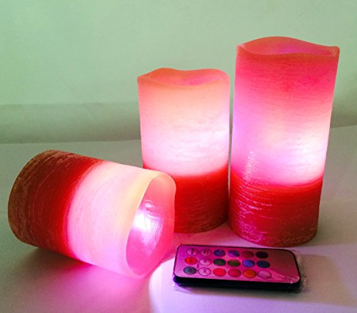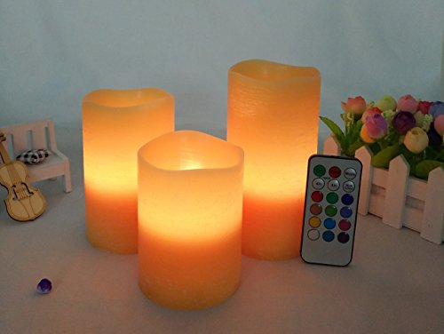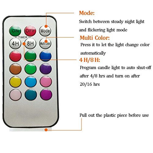 - --MULTI-function REMOTE Control(Remote will works from up to 20 feet away) gives you the option to control the FLICKER, set a 4-or 8-hrs timer,Auto-Circle 24Hour timer, Swith 12- Glowing light colors to be chosen from! Also set them to rotate through the color changing automatically! The flame sits deep inside the wax Candle to give you a REALISTIC Candles without the smoke or messy dripping wax!