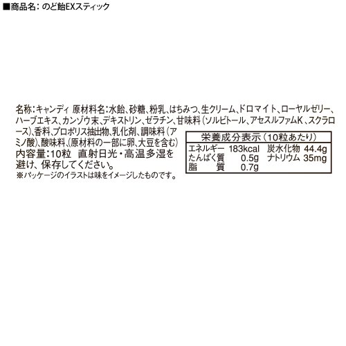 原材料:水飴、砂糖、粉乳、はちみつ、生クリーム、植物油脂、ドロマイト、ローヤルゼリー、ハーブエキス、キキョウエキス、プロポリス抽出物含有食品、カンゾウ末、デキストリン、甘味料(ソルビトール、アセスルファムK、スクラロース)、香料、乳化剤、調味料(アミノ酸)、酸味料、(原材料の一部に卵、大豆を含む)
