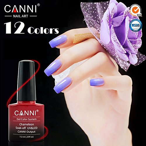 -. Binding : Health and Beauty -. Brand : CANNI -. Color : Magic -. EAN : 0603161634352 -. Feature : New Product Nail Art Design CANNI 7.3ml Soak Off UV/LED Gel polish Changing Color With 14colors / UV or LED lamp is required for these gel polishes / Magic of the uv color change nail gel : ( Hot-Cold ) -. IsAdultProduct : 0 -. Label : CANNI -. Manufacturer : CANNI -. PackageQuantity : 12 -. ProductGroup : Beauty -. ProductTypeName : HEALTH_PERSONAL_CARE -. Publisher : CANNI -. Size : 7,8ml -. Studio : CANNI -. Title : CANNI 7.3 ml UV Color Changing Gel Nail Polish, Set of 12 -. UPC : 603161634352