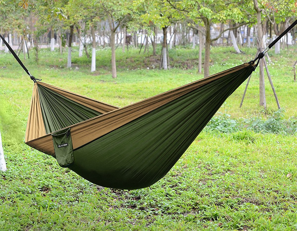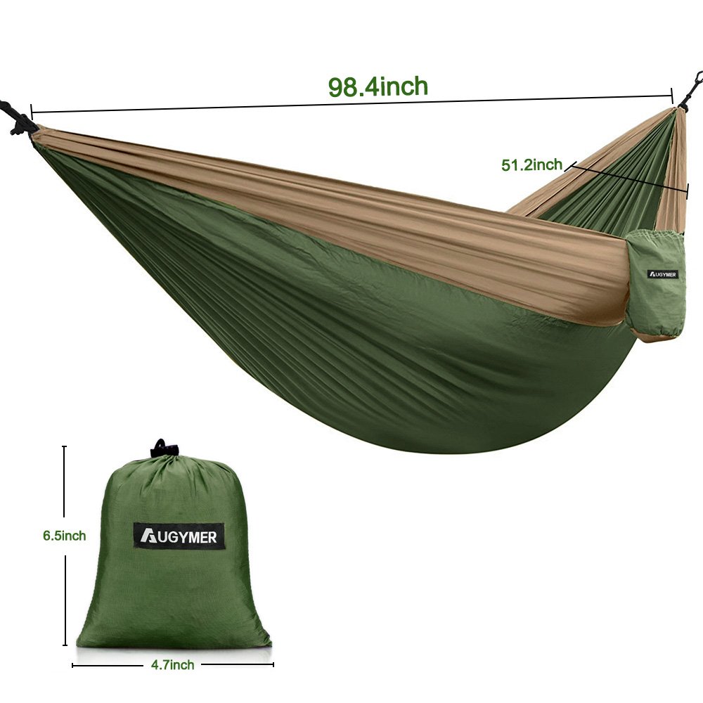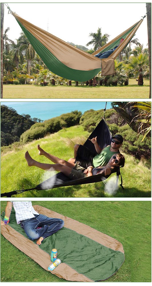 Despite the size of PET bottle large at the time of storage, it becomes a hammock of length 2.9 m × width 1.4 m when spreading, although it is around 700 g in size, it is surprising that two adults have space to sleep together.