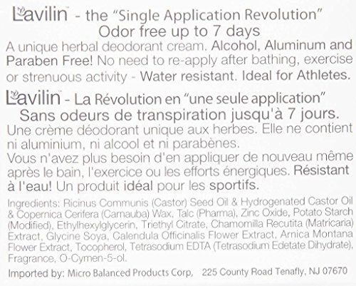 Chemical and aluminimum free deodorant works for days. Lavilin uses herbal extracts to elimate odor causing bacteria. Just one application keeps you odor free for days -- even showering won't reduct effectiveness.