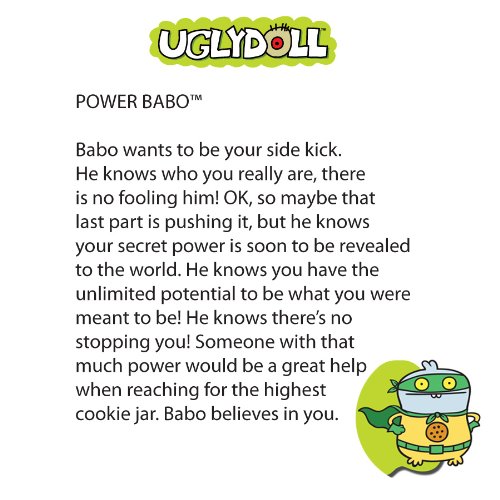 -. Binding : Toy -. Brand : GUND -. Color : Medium Yellow -. Department : unisex-child -. EAN : 0826451903222 -. Feature : Each of the characters has its own name and personality making them unique / Kids love their soft cuteness and adults collect them for their humorous bios / This family of plush, hable, friendly, colorful characters inspires everyone they meet and encourages creativity -. IsAdultProduct : 0 -. Label : Gund -. Manufacturer : Gund -. Model : 90322 -. MPN : 90322 -. NumberOfItems : 1 -. PackageQuantity : 1 -. PartNumber : 90322 -. ProductGroup : Toy -. ProductTypeName : TOYS_AND_GAMES -. Publisher : Gund -. Studio : Gund -. Title : Gund Uglydoll SDCC Power Babo, 15.7" Plush -. UPC : 826451903222 -. Warranty : Guaranteed against manufacturer defects