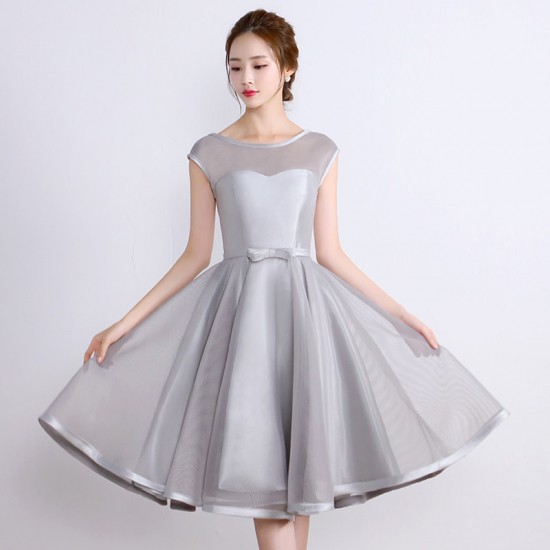 サテンとメッシュレースの、ひざ丈フレアワンピース。