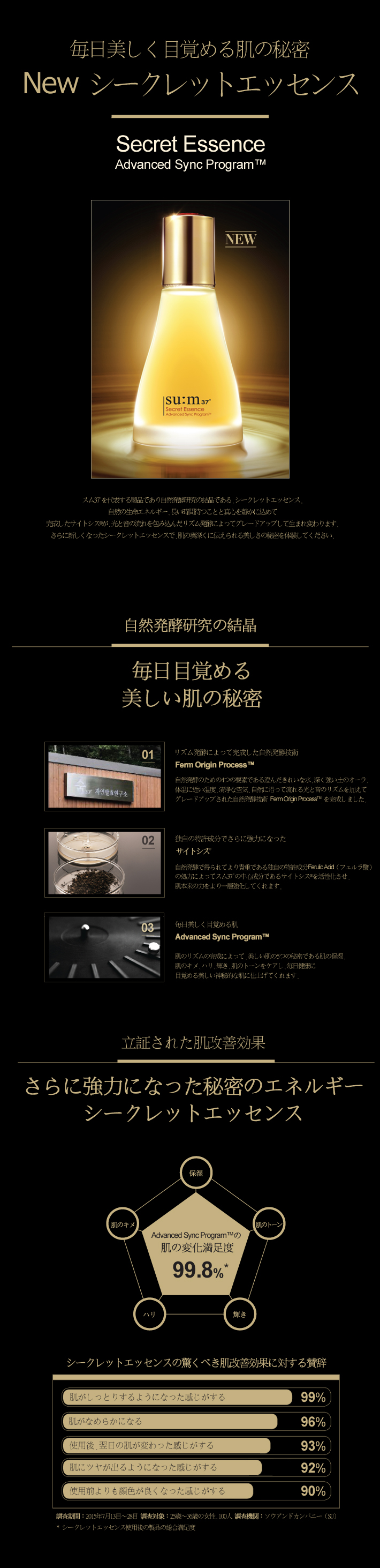 スム37°を代表する製品であり自然発酵研究の結晶である、シークレットエッセンス。 自然の生命エネルギー、長い時間待つことと真心を静かに込めて 完成したサイトシス®が、光と音の流れを包み込んだリズム発酵によってグレードアップして生まれ変わります。 さらに新しくなったシークレットエッセンスで、肌の奥深くに伝えられる美しさの秘密を体験してください。