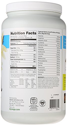 Only 110 Calories per scoop, 21 servings per container, Vega Protein Blend (pea protein, SaviSeed [sacha inchi] protein, hemp seed protein, sprouted whole grain brown rice protein) natural French vanilla flavors, Vega Green Blend (organic alfalfa grass powder, spinach powder, broccoli powder, organic kale powder), papaya concentrate powder (contains naturally occurring enzymes), stevia leaf extract, xanthan gum
