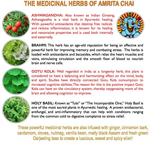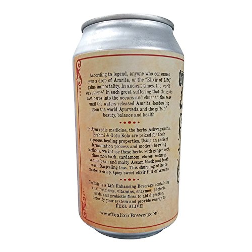 -. Binding : Misc. -. Brand : Tealixir Herbal Kombucha -. EAN : 0867055000061 -. Feature : DELICIOUS & REFRESHING: Amrita Chai features Ashwagangha, Brahmi, Gotu Kola and Holy Basil and is flavored by malty Assam black tea and traditional spicy-sweet chai spices. / FINEST INGREDIENTS: Our probiotic herbal elixirs are based on time honored traditions of herbal medicine and brewed for you with the very best of nature's pharmacy! All Natural - Probiotic - Vegan - Non GMO - Free Trade - Gluten Free - Non Alcoholic / AMAZING BENEFITS: Drink herbal kombucha to strengthen your immune system; for balancing, cleansing and detoxing your body; to provide energy and aid digestion. People have reported significant improvements to mental acuity and overall well-being, as well as ailments such as acid reflux and heartburn. / CONVENIENT PACKAGING: The 12 oz BPA free lined cans offer a draft fresh taste in a format that is perfect for the gym, beaches, pools, boats, festivals and other places where bottles are forbidden. And cans are perfect for kids! / UNIQUE PROCESS: Using modern brewing methods and an ancient fermentation technique our process allows for superior taste, a potent extraction of the therapeutic benefits of the herbs, teas and spices and lots of creativity! We do not simply add fruit juices to flavor our brews like every other kombucha brand on the market. -. IsAdultProduct : 0 -. Label : Tealixir Brewing Co. LLC -. LegalDisclaimer : Tealixir is a wonderfully healthy beverage BUT it is a food not a drug and is not intended to treat, cure or prevent any disease. Actual product packaging and materials may contain more and different information than what is shown on our website. We recommend that you do not rely solely on the information presented and that you always read labels, warnings, and directions before using or consuming a product. Please see our full disclaimer below. -. Manufacturer : Tealixir Brewing Co. LLC -. NumberOfItems : 12 -. PackageQuantity : 12 -. ProductGroup : Grocery -. ProductTypeName : GROCERY -. Publisher : Tealixir Brewing Co. LLC -. Size : 12 oz -. Studio : Tealixir Brewing Co. LLC -. Title : TEALIXIR HERBAL KOMBUCHA - Amrita Chai - Inspired by Ayurvedic medicine, this herbal tonic features Ashwagandha, Brahmi & Gotu Kola which are prized for their vigorous healing properties. ~ 12 Pack -. UPC : 867055000061