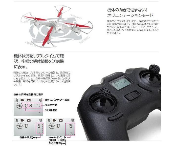 動画・静止画を撮影可能な、高解像度HDカメラを機体に内蔵。双方向通信により、機体のバッテリー残量や高度・距離を送信機に表示。また、信号が途絶えると、自動で帰還するフェイルセーフ機能が付いています。 |