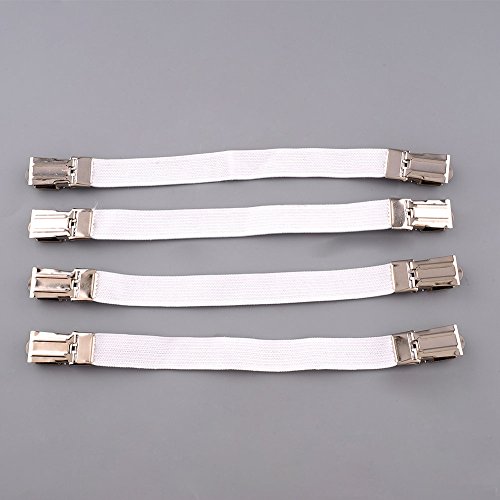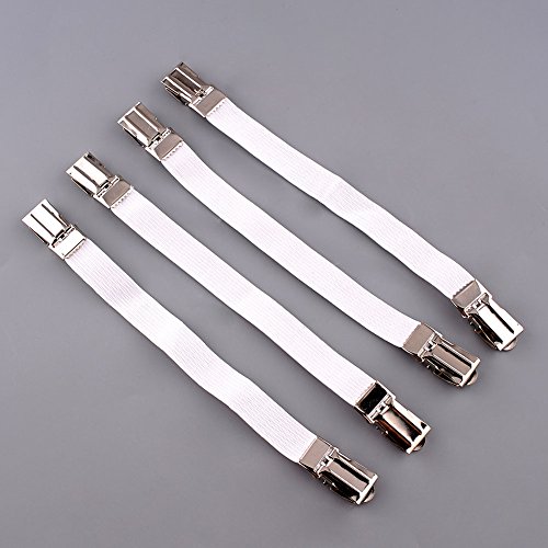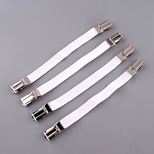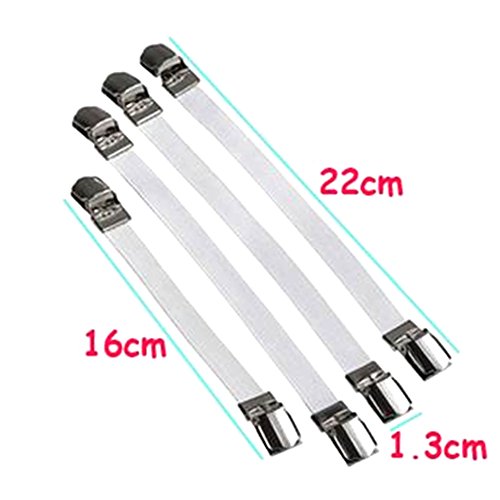 -. Feature : Material: Nylon elastic cloth belt and metal clip Size:Longest 22CM/8.8inch shorter:16CM/6.4inch Width:1.3CM/0.52inch / Adjustable length- All straps are adjustable. Works with all types of bed sheets, fitted sheets, flat sheets ,mattress pads,sofa,table,baby's cribs and more. / Easily attach - Attach this suspender to your bed sheet using the clamps.Keep your bed sheets,slipcover,tablecloth in position. / Durability - Made of sturdy chrome metal clips and heavy duty wide elastic bands. / Protection -Built-in plastic clenching system does not harm fabric,Durable elastic and nickel plated clamps are strong but will not damage the bed sheets.