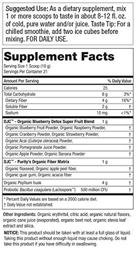 Enjoy the benefits of juicing-plus added fiber-without the hassle! Purity's Certified Organic OJC Blueberry Detox powers your active lifestyle by serving up an array of organic super fruits, organic fiber and nourishing berries to revitalize your body.*