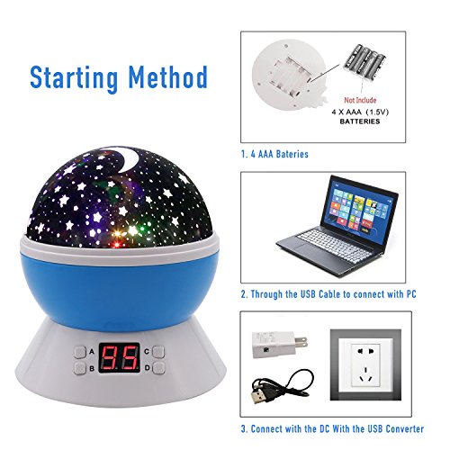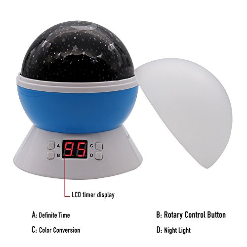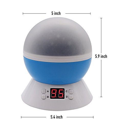 - EASY TO CONTROL 4 MODELS: 5 Buttons to control this amazing lamp.RED Button:ON/OFF; A Button: Control the timer from 5 Minutes to 95 Minutes; B Button: Control the Rotation; C Button: There are 4 color options, blue, yellow, red, green and multi-color. You can choose to have one color or multiple colors at one time; D Button: night light table lamp Mode.