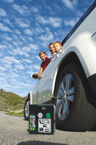 - Feature : Just push the green button and just like that no more flat. / Features a 12 volt inflator which activates by the push of a button and forces air and sealant into the tire. Repairing it in just 7 minutes. / Easy, fast and safe to use / Seals punctures up to 1/4" and is tire pressure sensor friendly. / Safety light for night use