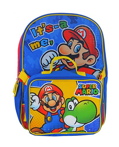 Super Mario Backpack with Lunch Bag Backpack measures approx. 16" x 12" x 5" 1 mesh side pocket for water bottle Lunchbox measures 9" x 8" Easy remove/attach matching soft lunch box