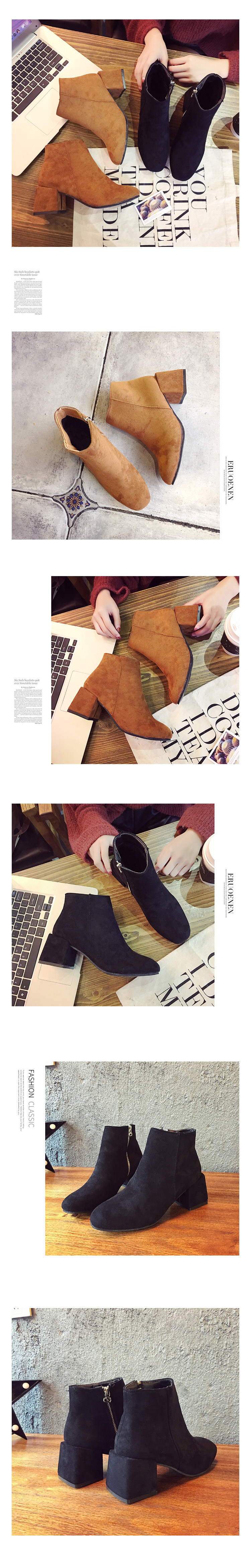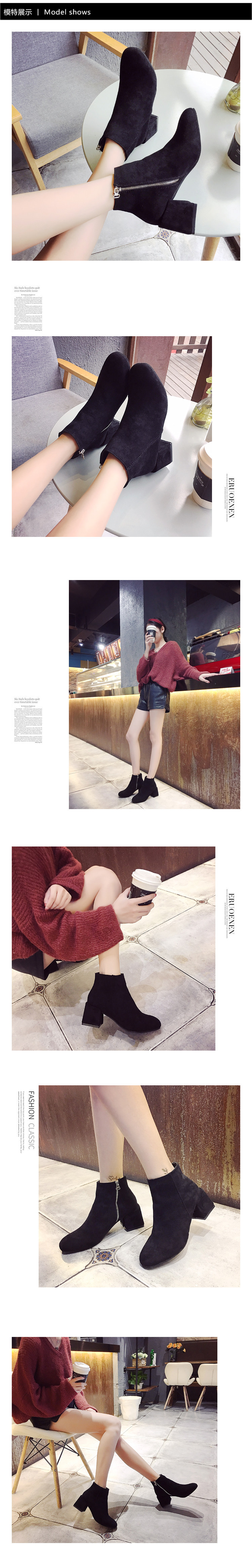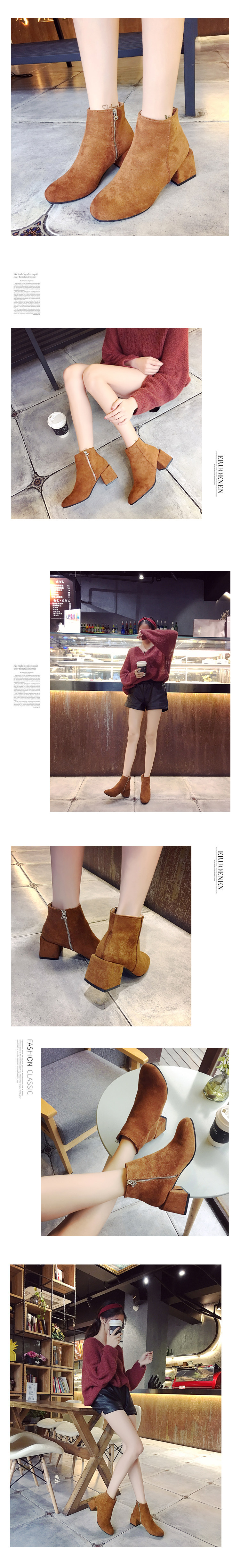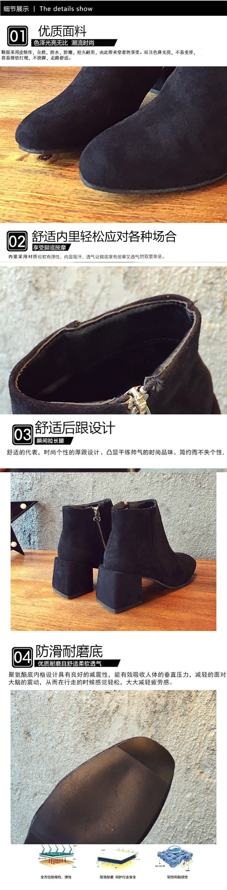 短靴女秋冬季新款欧美复古方头粗跟高跟马丁靴侧拉链磨砂裸靴