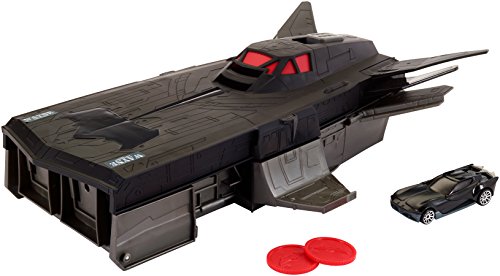 -. Feature : Transport the entire Justice League in the latest Batmanvehicle, the Flying Fox from the new Justice League movie. / This new vehicle can transport up to 6 Character Cars, fires discs while in flight mode, and transforms into a mobile base for 2-in-1-action play! / Use your Batman Character Car to take the Flying Fox on missions. Once you have landed the Flying Fox, open the vehicle up to reveal the Justice League base of operations in the interior of the ship. / There's an elevator that goes to three distinct levels and can be used as a side-by-side race ramp when track is connected / There are four other track connection points that can be accessed by lowering the ramps positioned around the base of the ship, as well as two secret escape hatches located in the rear for quick getaways