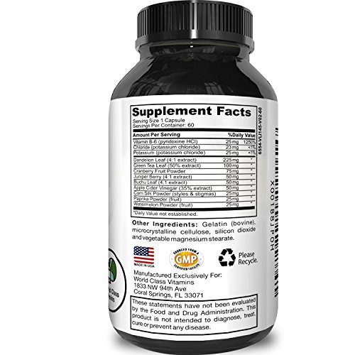 These Pure Natural Diuretic Water Pills contain potent ingredients like Vitamin B6, Potassium, Dandelion Root, Cranberry, Green Tea Extract, Juniper Berry, Bucchu Leaves, Apple Cider Vinegar, Corn Silk, Paprika, and Watermelon. All of these extracts wok well together to promote relief from the typical symptoms of water retention such as bloating and weight gain.