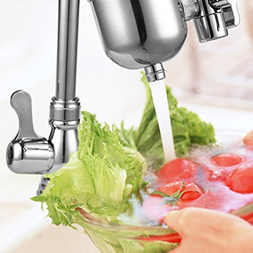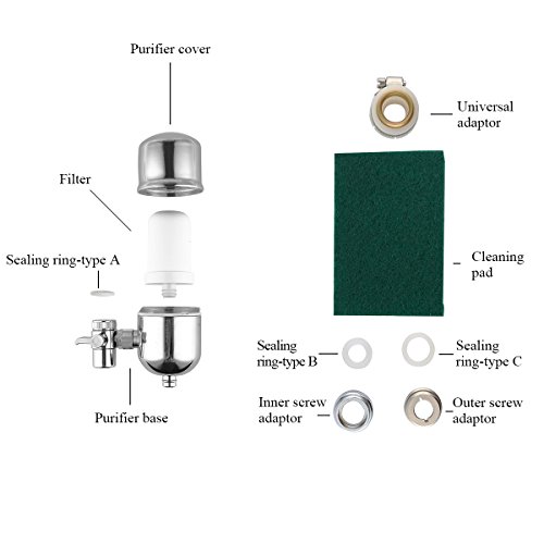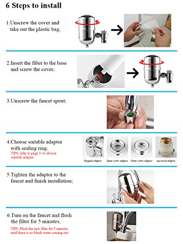 Attribute: Type:Faucet water filter Color:Metal color Material : 304 Stainless Steel Include: Filter, Cartridge, Adaptors, User's manual, Gasket, Brush Water temperature: Maximum 60℃,Minimum 4℃ Filter replacement: 200 gallons or 3 months (depending on the water quality usage frequency) Suitable faucets: 1. Faucets with outside threaded: The outside threaded diameter is about 21.5mm. 2. Faucets with inner threaded: The innner threaded diameter is about 23.5mm. 3. Faucets without threaded : The outside diameter is 15~21mm. 4. Other style faucets : Please give us pictures ,we will help you make sure it. 5. Pull-out and hand-held faucets are not suitable; What does the filter medium contain? Ceramic wall: The ceramic wall can block contaminants over 0.1um, such as coli,salmonella, MRSA, rust, and big particles. Activated carbon: The activated carbon reduces odor, organics, chlorine, phenol, arsenic, lead, cyanide,ect. KDF: The KDF is a reliable filtration media verified by NSF and WQA already. KDF reduces some heavy metals including lead, mercury, copper, nickel, cadmium, arsenic, antimony, fluorid, ect. And the KDF also restrains the bacteria reproduction. MicroNose: MicroNose, a filtration media from California, removes arsenic and toxic heavy metals without chemical adjustment. This NSF-proven filtration media reduces carcinogenic, nitrates , and heavy metal ( 99% arsenic, mangenese, ect.) Post activated carbon: Improve water taste, make water fresh and crisp. PP: Remove rust and particles further. 0