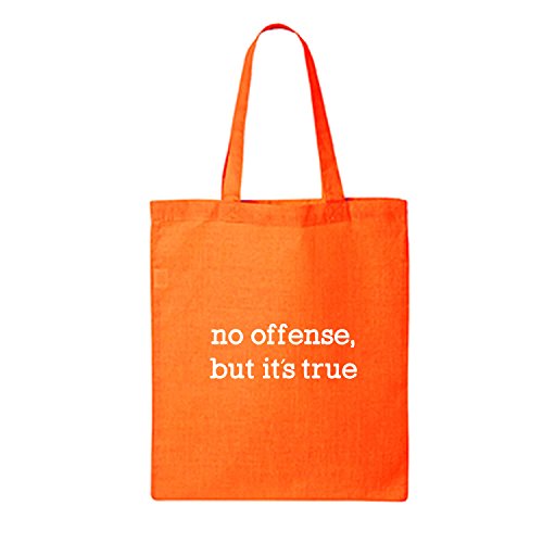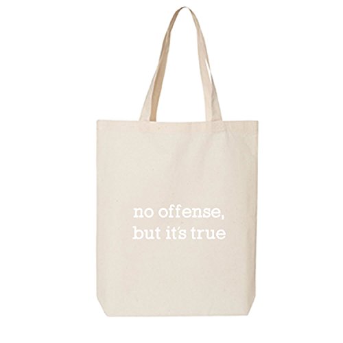 Product DescriptionThis cotton canvas tote bag features "No offense, but it's true" on the front. 15" Wide x 16" High x 3" Deep with 20" handles. Printed in the USA on an imported bag.0