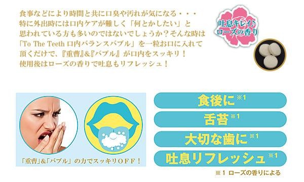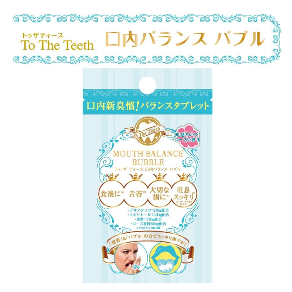 | 食事などにより時間と共に、口臭や汚れが気になる方におすすめのバランスタブレットです。「重曹」と「バブル」が口内をスッキリ!!使用後はローズの香りで吐息もリフレッシュ♪ |