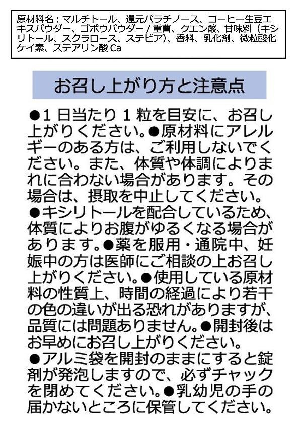 | 原材料 | 名称:コーヒー生豆エキスパウダー含有食品 マルチトール、還元パラチノース、コーヒー生豆エキスパウダー、ゴボウパウダー/重曹、クエン酸、 甘味料(キシリトール、スクラロース、ステビア)、香料、乳化剤、微粒酸化ケイ素、ステアリン酸Ca |