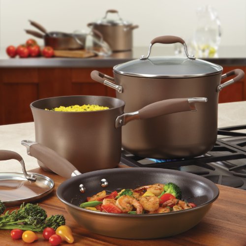 • Hard-anodized construction offers efficient, even heat distribution; features warm bronze nonstick exterior, chocolate interior and flared tulip shape