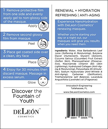 Experience NanoHydraton with DeLeon Cosmetics' face mask. Our NanoHydration technology combined with our cosmetic gel maximizes anti-aging, anti-wrinkle and renewal benefits. Our cosmetic gel features Hyaluronic Acid, Vitamin B3, Collagen and Cucumber Extract.