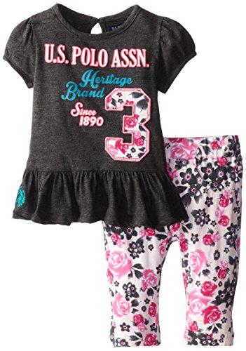-. Binding : Apparel -. Brand : U.S. Polo Assn. -. Department : baby-girls -. Feature : Number 3 applique on front center of t-shirt matches pant print / Pony logo embroidered on peplum hem and pant back pocket / Capri 5 pocket style knit pant -. Label : US Polo Assn. Children's Apparel -. Manufacturer : US Polo Assn. Children's Apparel -. PackageQuantity : 1 -. ProductGroup : Apparel -. ProductTypeName : SHIRT -. Publisher : US Polo Assn. Children's Apparel -. Studio : US Polo Assn. Children's Apparel -. Title : U.S. Polo Assn. Baby Girls' Bubble Sleeve Peplum Top and Leggings