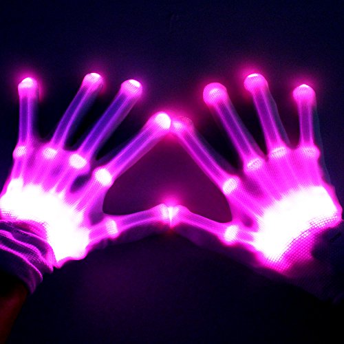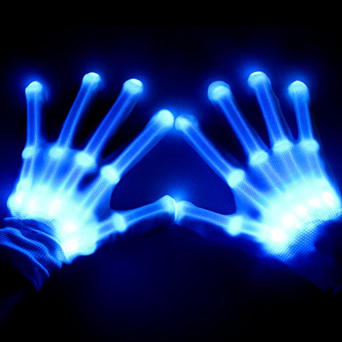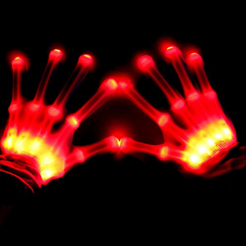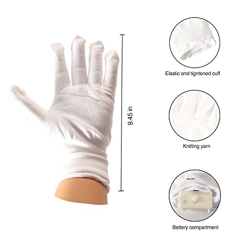 Paper bats are afloat in the sky, with fake cob webs and carved pumpkins¡ now all you need to complete your Halloween party is a show-stopping accessory that will bring all the attention to your Halloween costume.? With Theefun LED Skeleton Gloves, it's a bundle of fun packed in colorful glowing gloves! Powered by 2 lithium metal batteries within each glove, up your scary costume factor with skeleton-like hands that glow in 12 different vibrant colors. And when the scariest day of the year is over, use them at the club, concerts, dance parties and more. We guarantee that the spotlight will be on you How to Use 1.?? ?Pull out the white insulation paper (at the edge of the glove) before use. 2.?? ?Press On/Off button to turn it on. The first press activates lights of 12 colors flickering alternately, and then the mode will light steadily with 12 colors. The second press will light in a singular color, and other alternate presses will change the color. The colors are Blue, White, Orange, Green, Purple, Pink, Yellow, Light Green, Light Blue, Light Pink, and Light Purple. 3.?? ?Pull out the batteries after use to prevent the loss of batteries. 4.?? ?Replace with new batteries when the old batteries are weak on power. Notice No washing, no soaking in water. Specification Overall Length: About 9.25 inches Middle Finger Length: 4.92 inches Palm width: 3.14 inches Color: White Battery: 2 * ACR2032 (Included) Package Content 1 Pair * Glove