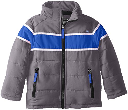 YMI Little Boys' Bubble Jacket with Contrasting Horizontal Racing Stripe and Detachable Hood, Charcoal, 7