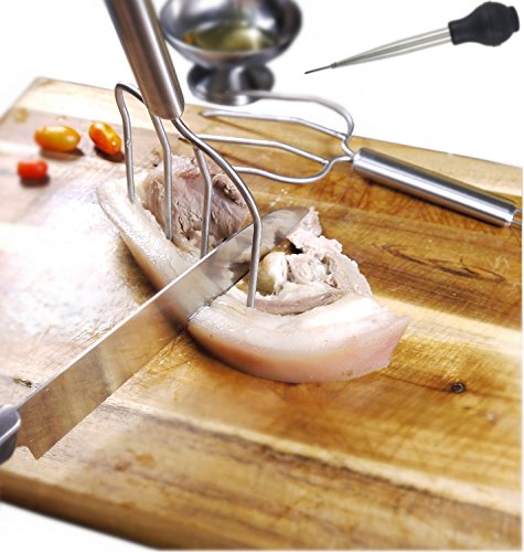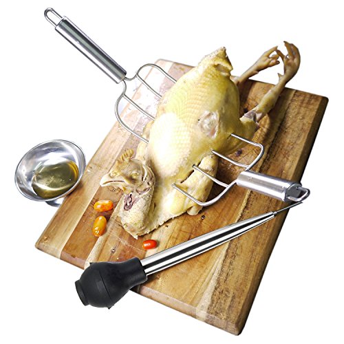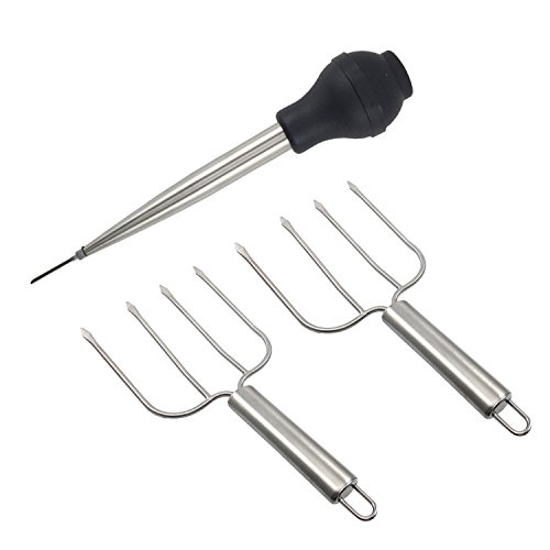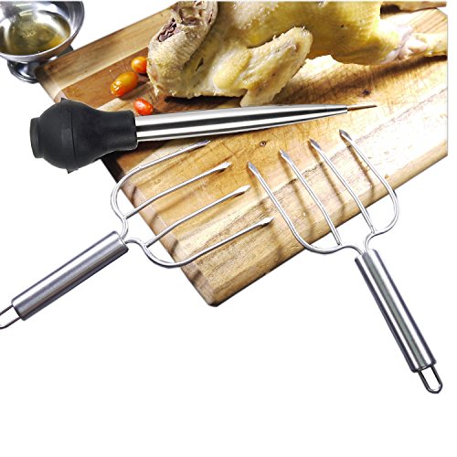 Description Perfect for lifting and roast turkey, beef, lamb, pork, chicken and large pieces meat, long sturdy handle good to grip to avoid the hot food burns, the sharp prongs easily pierce and hold the meat, which to makes transferring meat from pan or oven to carving board or platter much easier,good to guard the knife when cutting and slicing the meats Turkey baster with stainless steel injector needle and cleaning brush accessories,perfect to infuse flavorful juices, herbs, sauces and fats