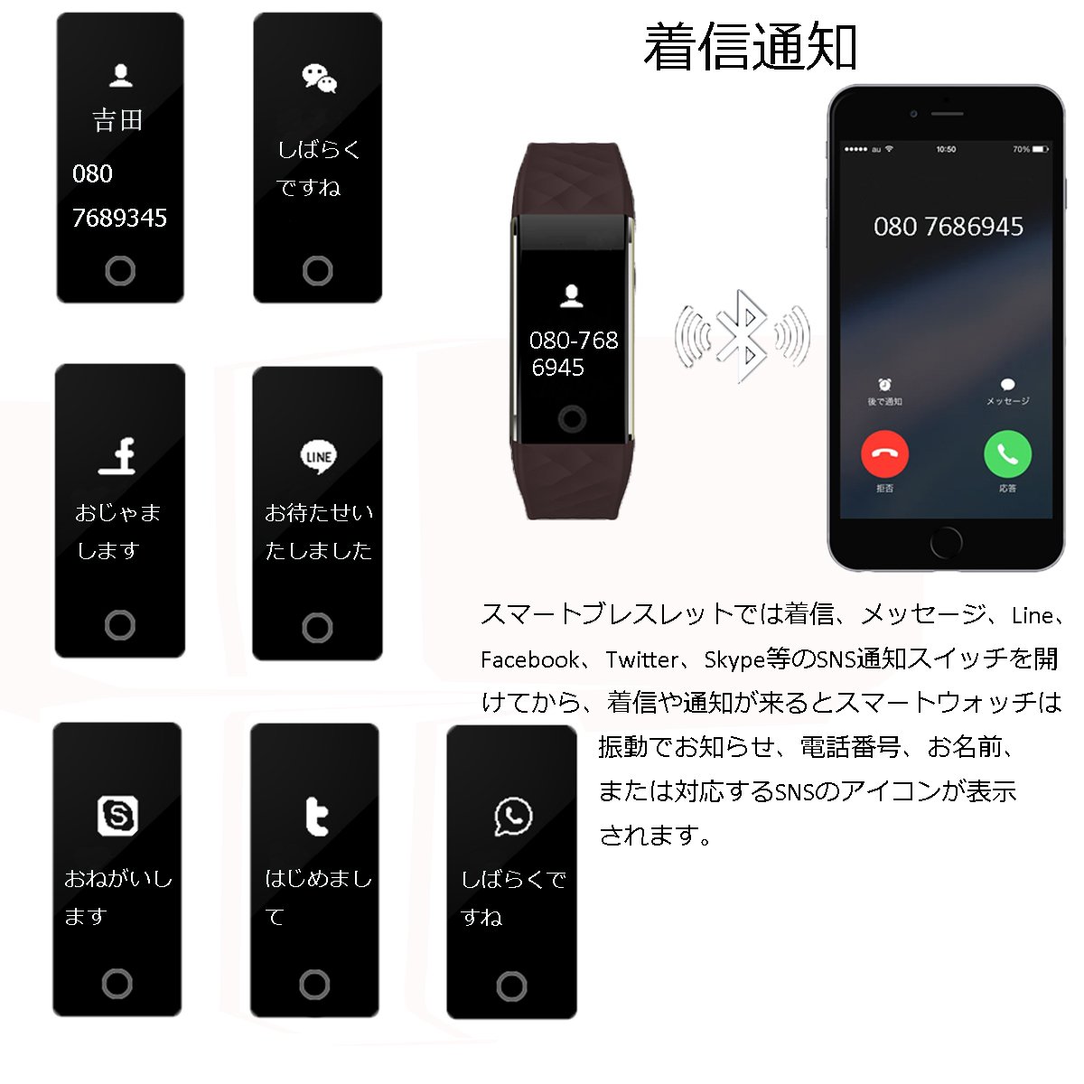 In smart bracelets, when an incoming call or notification arrives after opening SNS notification switch such as incoming call, message, Line, Facebook, Twitter, Skype, etc., smart watch informs with vibration, telephone number, name or corresponding SNS icon