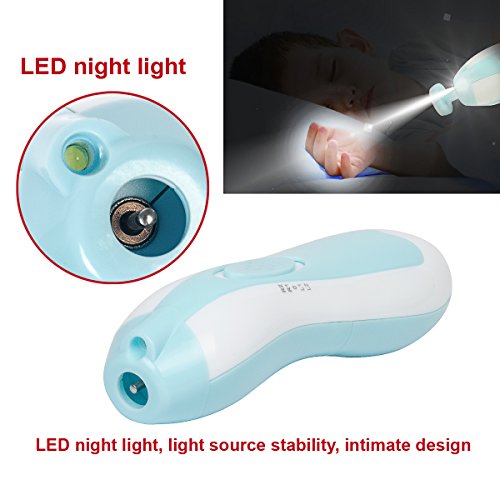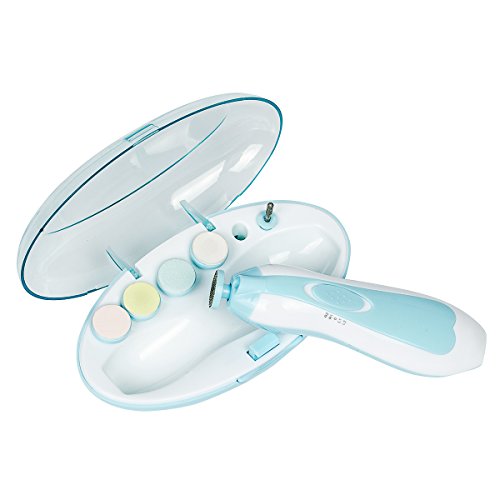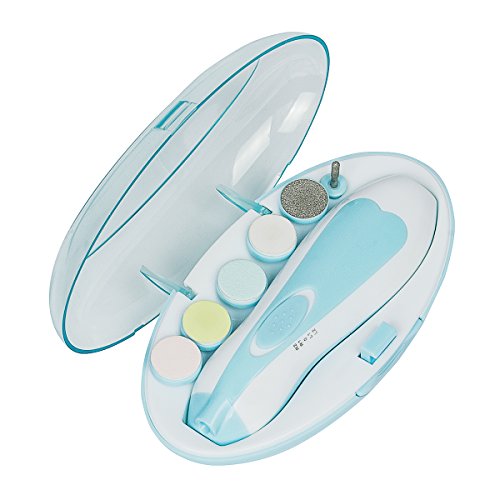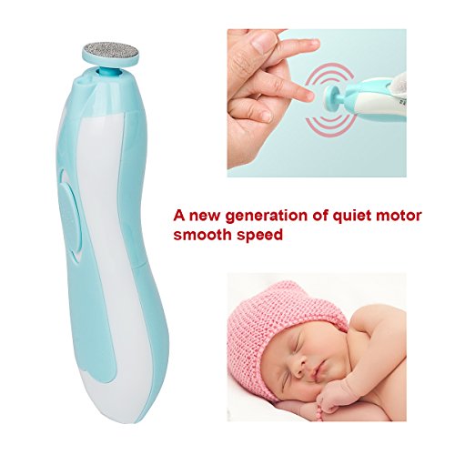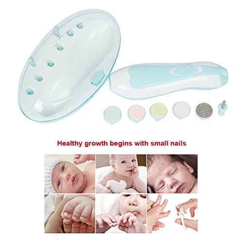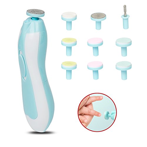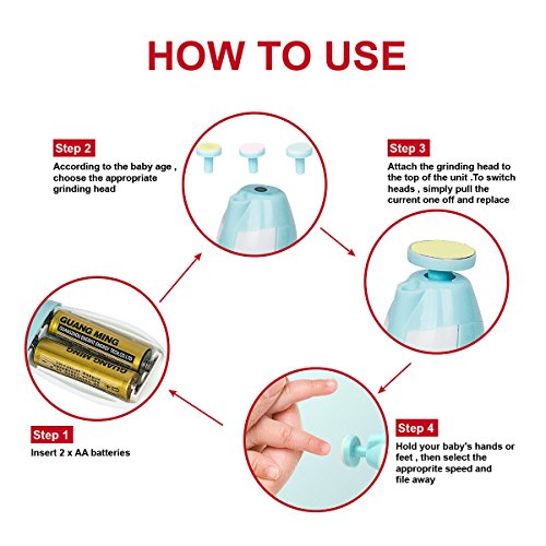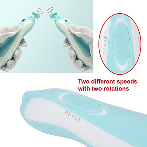 9 Grinding Heads: *For Baby Use Two yellow grinding heads : for 0~3 months old baby Two pink grinding heads : for 4~11 months old baby Two blue grinding heads : for over 12 months old baby or toddlers *For Adult Use White one: used for polishing the toenails or fingernails Metal grinding head : grinding the dead skin and calluses around nails Cylinder grinding head: grinding the nail edges 4 Working Modes: