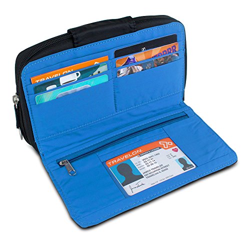 Bring along your essentials and protect your private information safe with the Travelon RFID-Blocking Clutch Wallet. This zippered clutch wallet is the perfect accessory for a quick trip to the store, a night out on the town, or an afternoon at the ballpark. It features a built-in wallet section with 6 card slots, an ID slot, zippered section for change, plus areas for currency. The back then features a zippered section ideal for your phone, loose items, and more. Plus, the clutch features built-in RFID protection, which stops the transmission of personal information from your credit cards, drivers license, and more The clutch has a detachable wrist strap so you can carry it around your wrist or slip it inside of a larger bag.