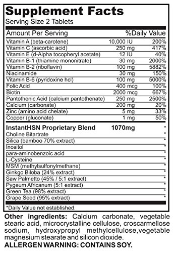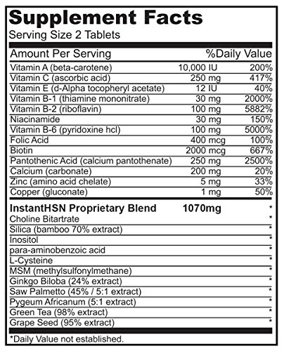 -. Title : Instant HSN All-Natural PERFECT Triple Strength Hair, Skin, and Nails Strengthening Formula MAXIMUM Strength biotin hair growth supplement, clear skin acne supplement, and stronger nails blend of Biotin, Vitamin A, MSM, Green Tea extract, Vitamin C, Vitamin E, Saw Palmetto, Calcium, Zinc, Vitamin B-1, Niacinamide, Pantothenic Acid, Copper, Choline Bitartrate, Silica, Inositol, Para-aminobenzoic Acid , Ginkgo Biloba, Pygeum Africanum, Grape Seed extract, L-Cysteine, Vitamin B-6 , Folic Acid, and Vitamin B-2 in One Daily Hair, Skin, and Nails Supplement.