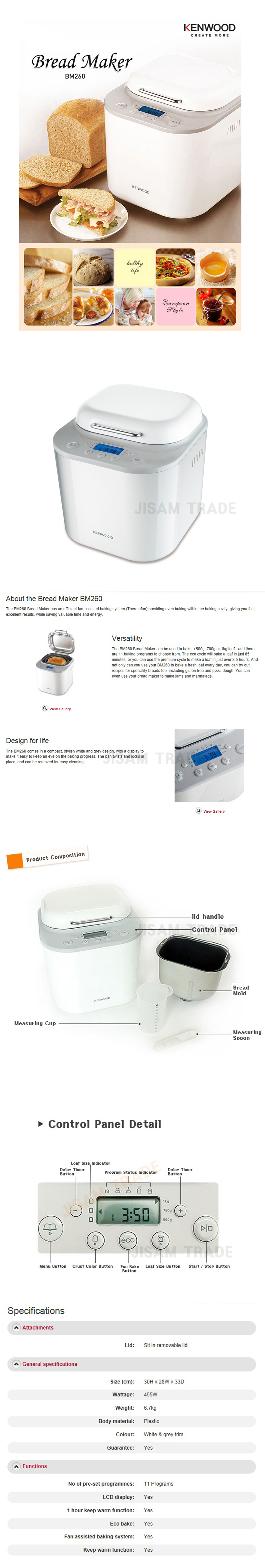 The BM260 Bread Maker can be used to bake a 500g, 700g or 1kg loaf - and there are 11 baking programs to choose from. The eco cycle will bake a loaf in just 85 minutes, or you can use the premium cycle to make a loaf in just over 3.5 hours. And not only can you use your BM260 to bake a fresh loaf every day, you can try out recipes for speciality breads too, including gluten free and pizza dough. You can even use your bread maker to make jams and marmalade.Design for life The BM260 comes in a compact, stylish white and grey design, with a display to make it easy to keep an eye on the baking progress. The pan twists and locks in place, and can be removed for easy cleaning.