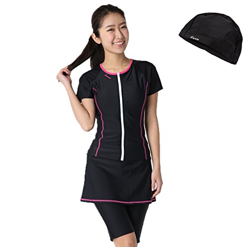 -. Feature : 体型カバー フィットネス水着 セパレート 競泳水着 フロントファスナーで着脱簡単!! / 長めのパンツの丈とスカートが露出をおさえて体型カバーのできる フィットネス水着 ♪ / 大きいサイズ めくれ防止スナップで上着のめくれを防ぎ安心♪ / バストを綺麗に見せる円形厚型パッド仕様。美しいラインをつくります。 / 締め付けの少ないゆったりスイムキャップをおつけしております