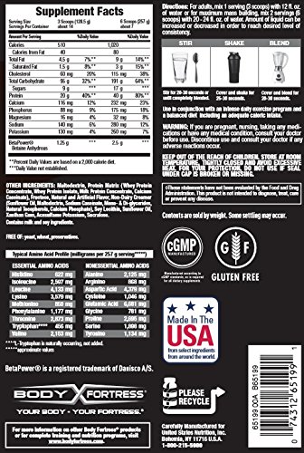ReleaseDate : 2016-04-10 Studio : NBTY Sports Nutrition Publisher : NBTY Sports Nutrition Binding : Health and Beauty Product Description Body Fortress Super Advanced Mass Gainer features protein with a surplus of calories, carbs, and other nutrients. For adults, mix 1 serving (3 scoops) with 12 fl. oz. of water or for maximum mass building, mix 2 servings (6 scoops) with 20-24 fl. oz. of water. Amount of liquid can be increased or decreased in order to reach desired level of consistency. Stir, Shake, or Blend for 20-30 seconds until completely blended. Use in conjunction with an intense daily exercise program and a balanced diet including an adequate caloric intake.