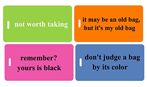 Binding : Apparel Product Description 4pc Funny Phrases luggage tags made of durable acrylic. Special price you save $8.00 Each tag has a clear window with a removable ID information card. If you wish to keep your information private, simply place the card information side down in the tag window. Vinyl loop included to attach the tags to your luggage. Tag Size: 4.25 inches X 2.25 inches 0
