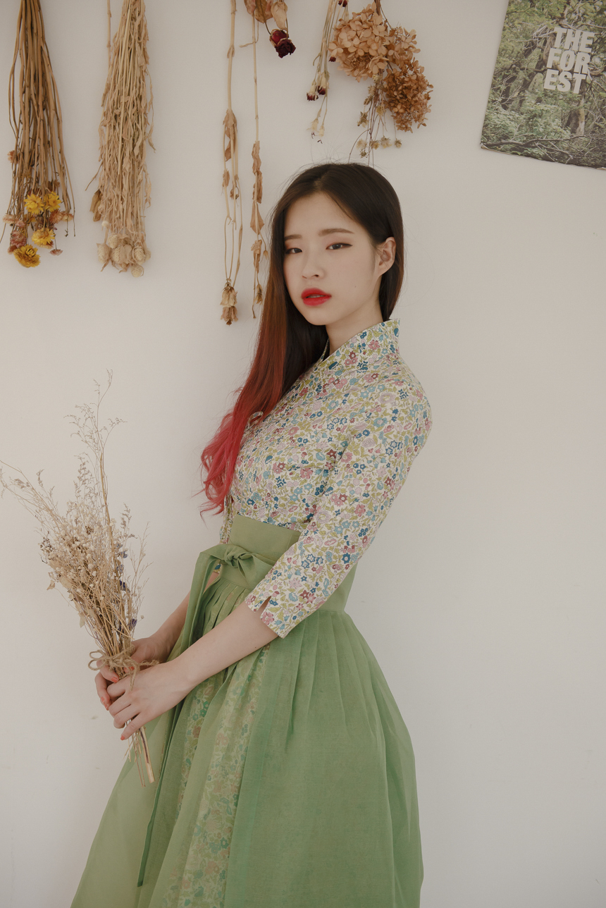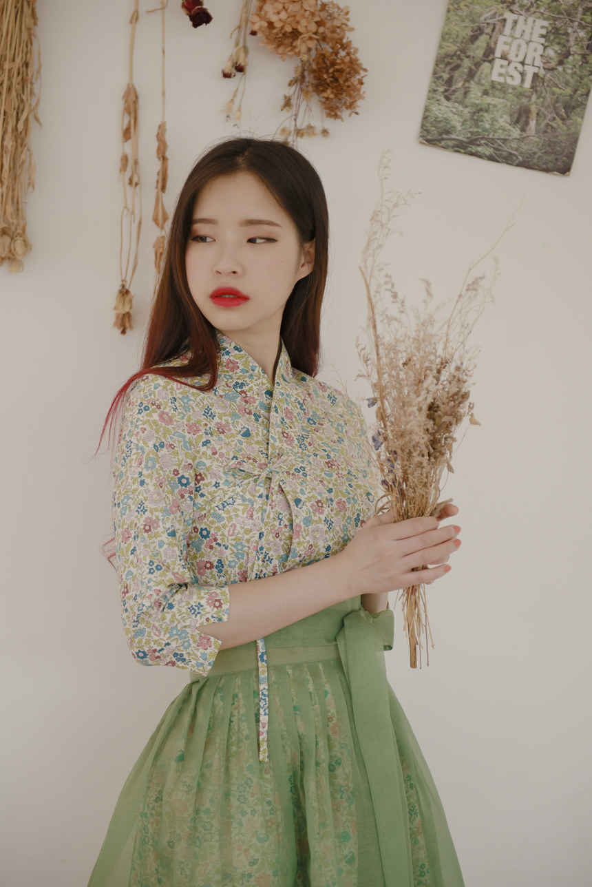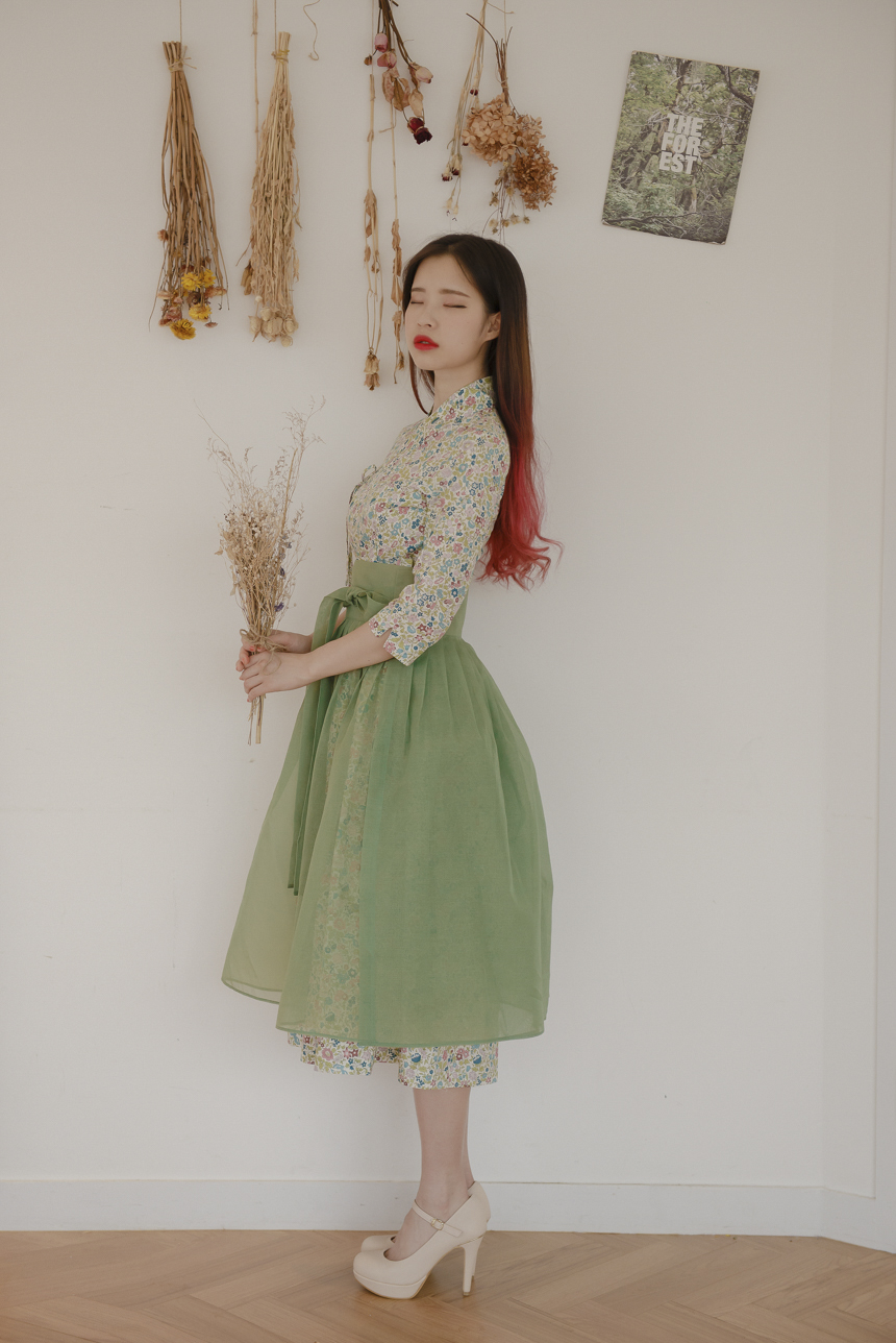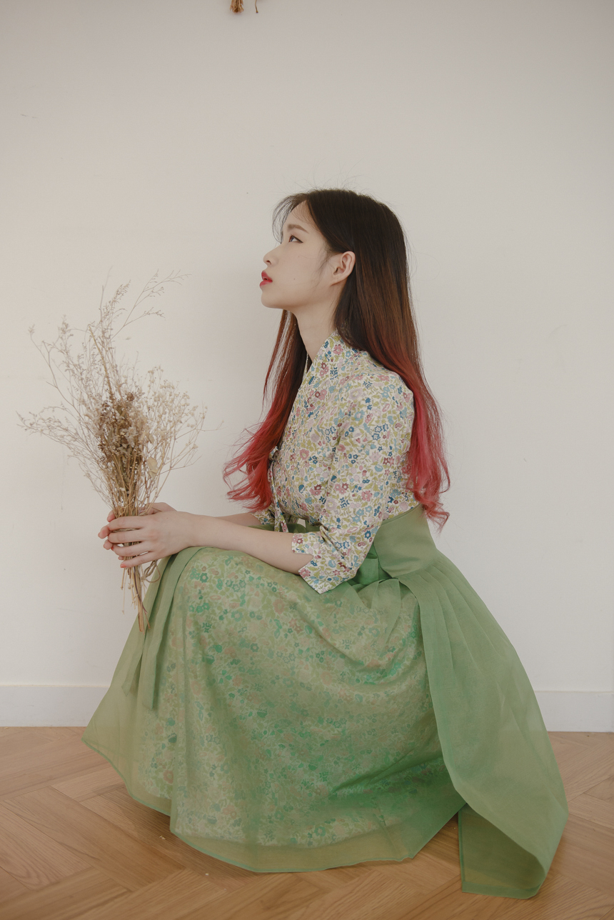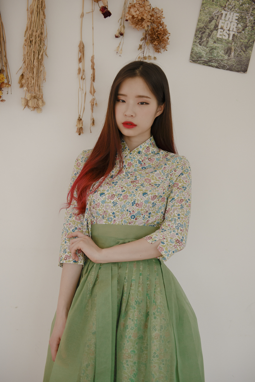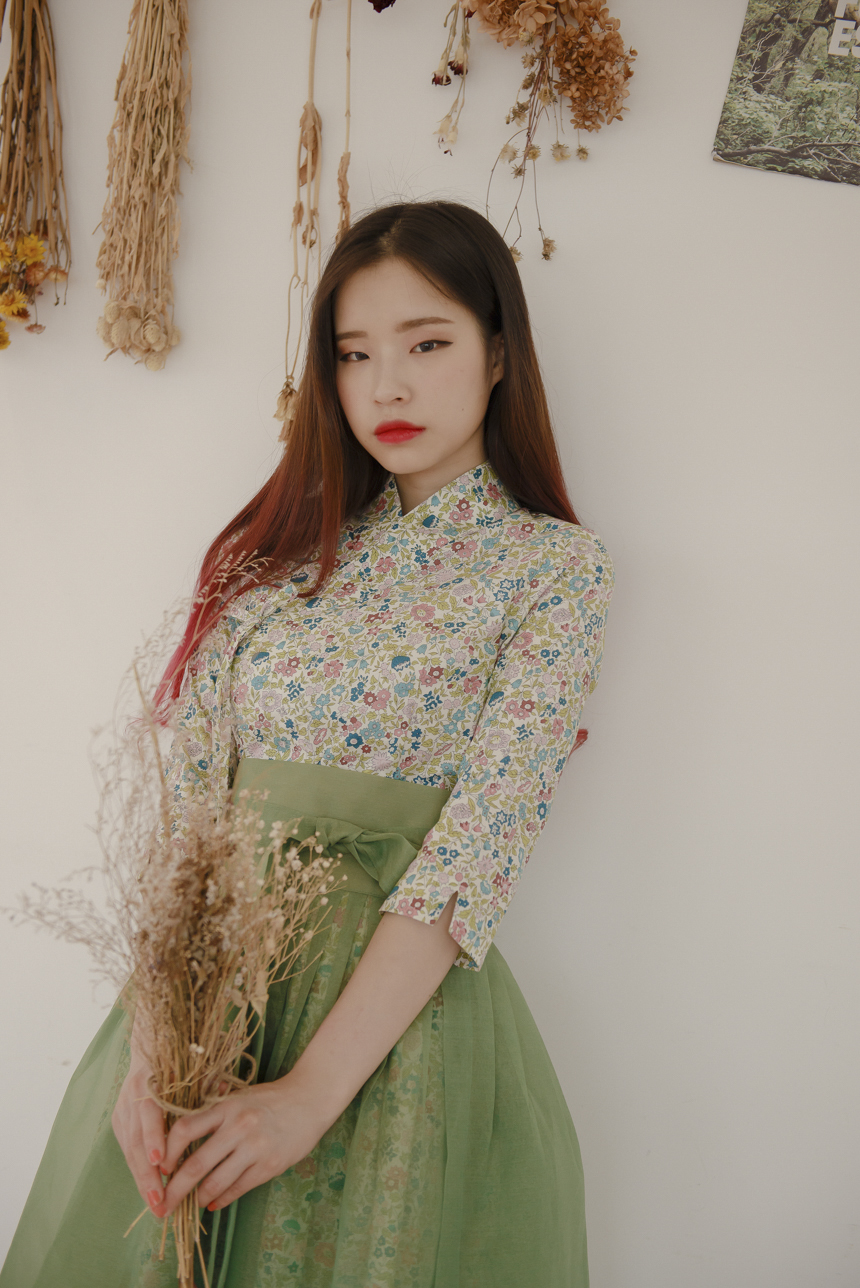 허브 연두색 한복원단 허리치마를 함께 코디해서 입으시는 꽃닮의 특별한 생활한복입니다.