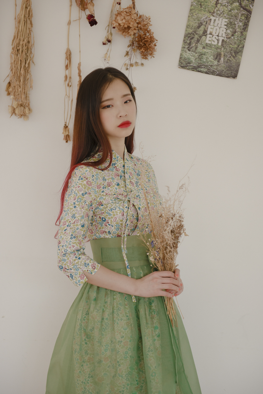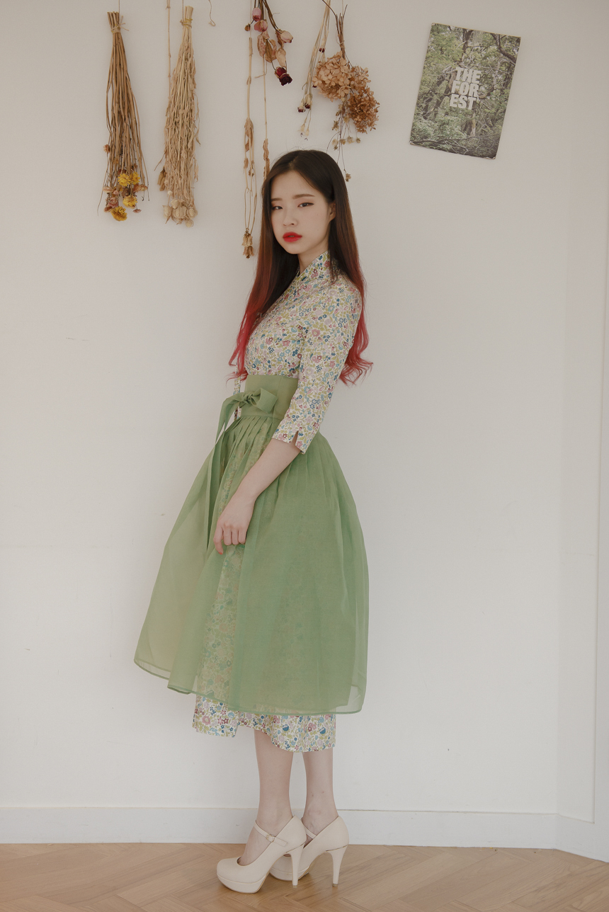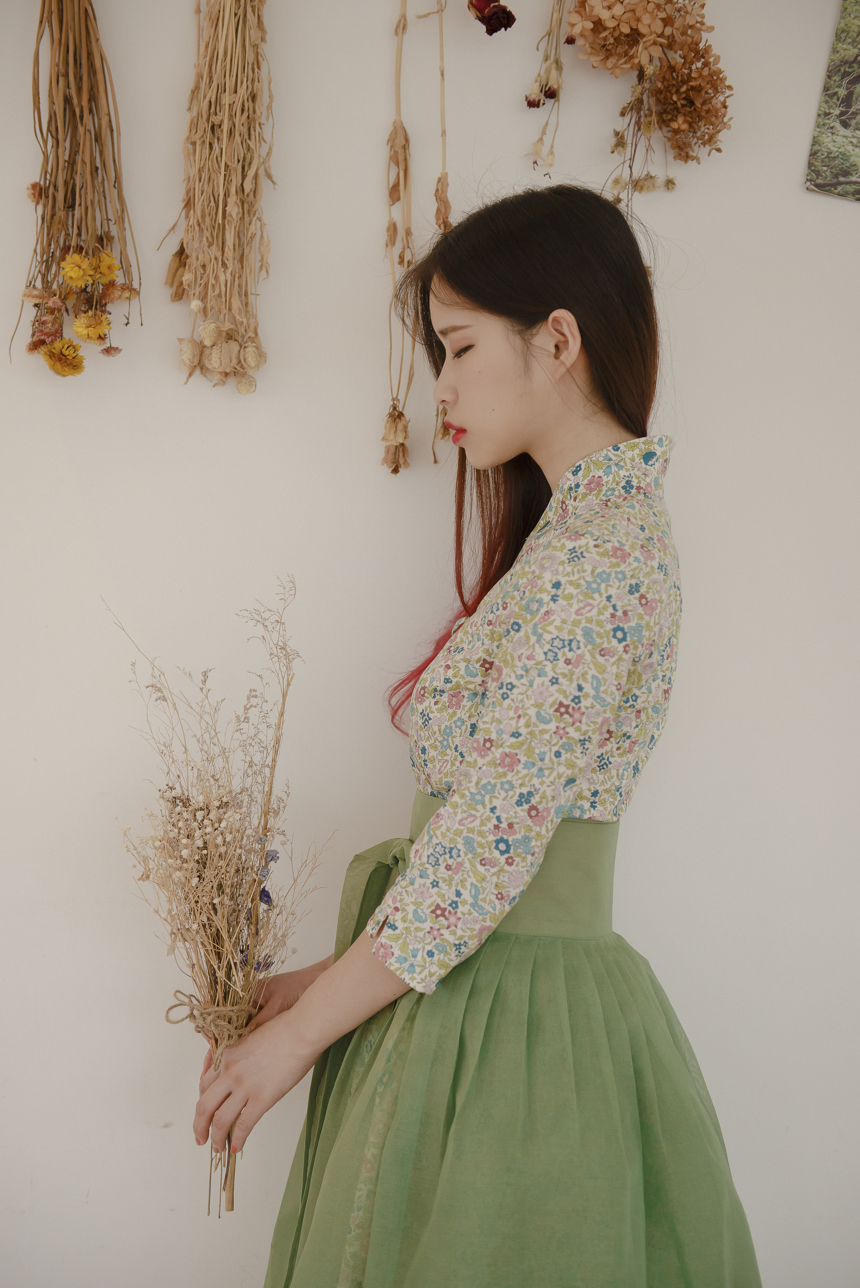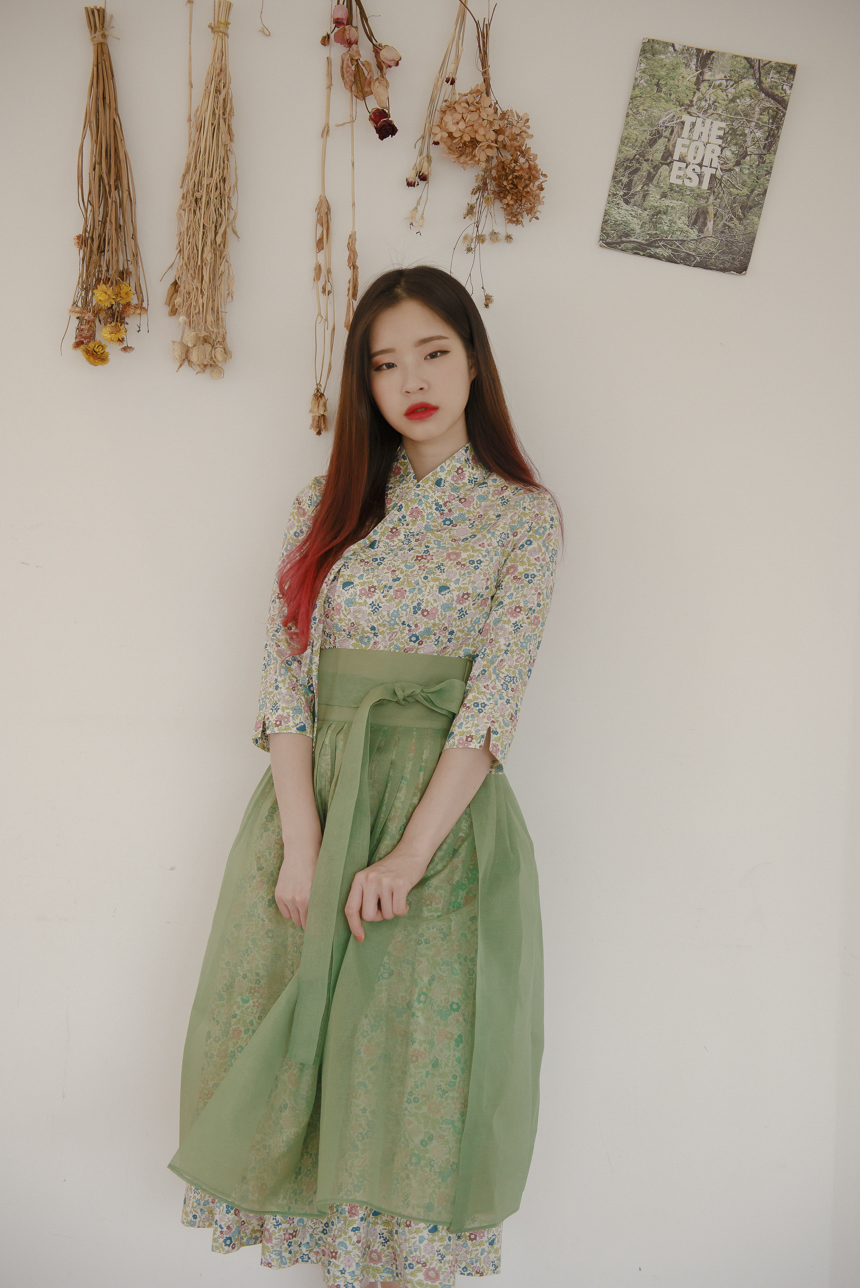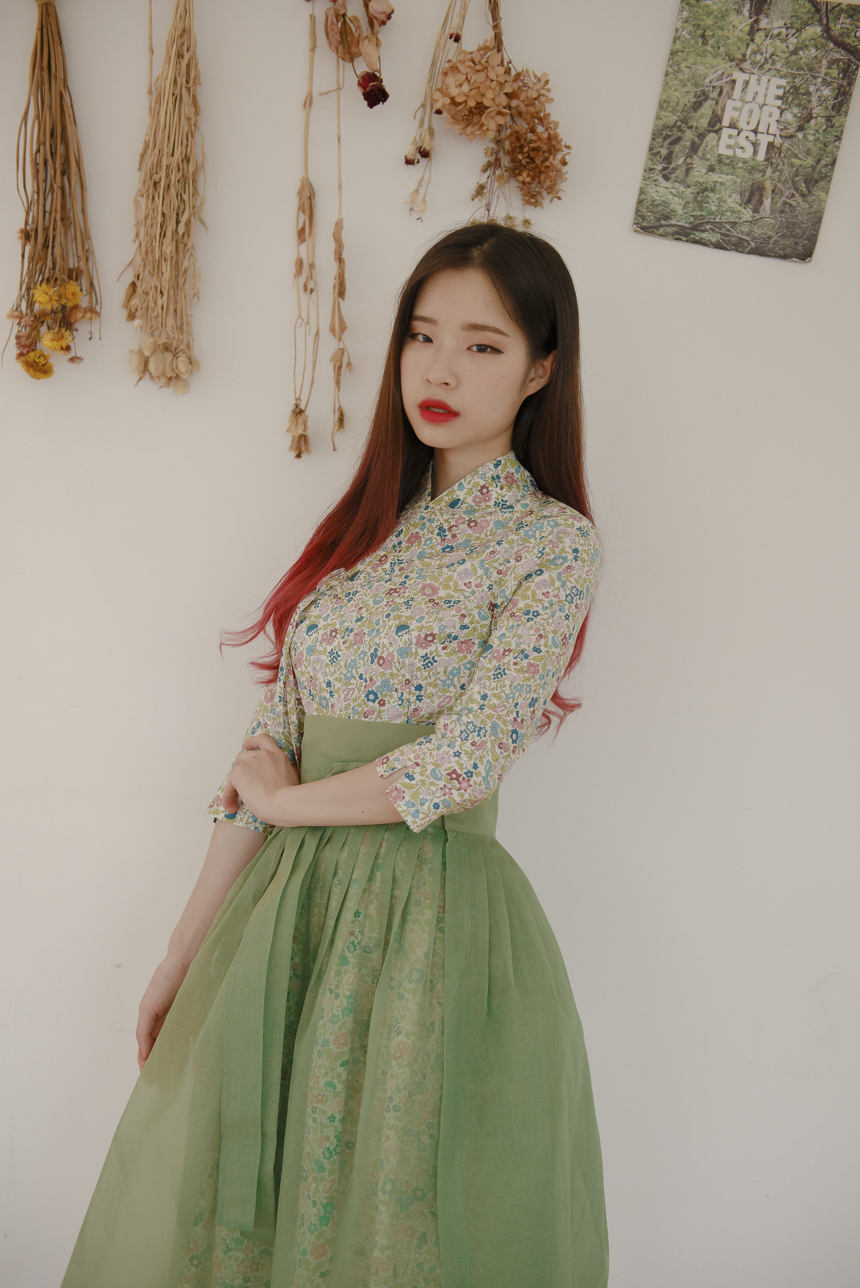 허브 연두색 한복원단 허리치마를 함께 코디해서 입으시는 꽃닮의 특별한 생활한복입니다.
